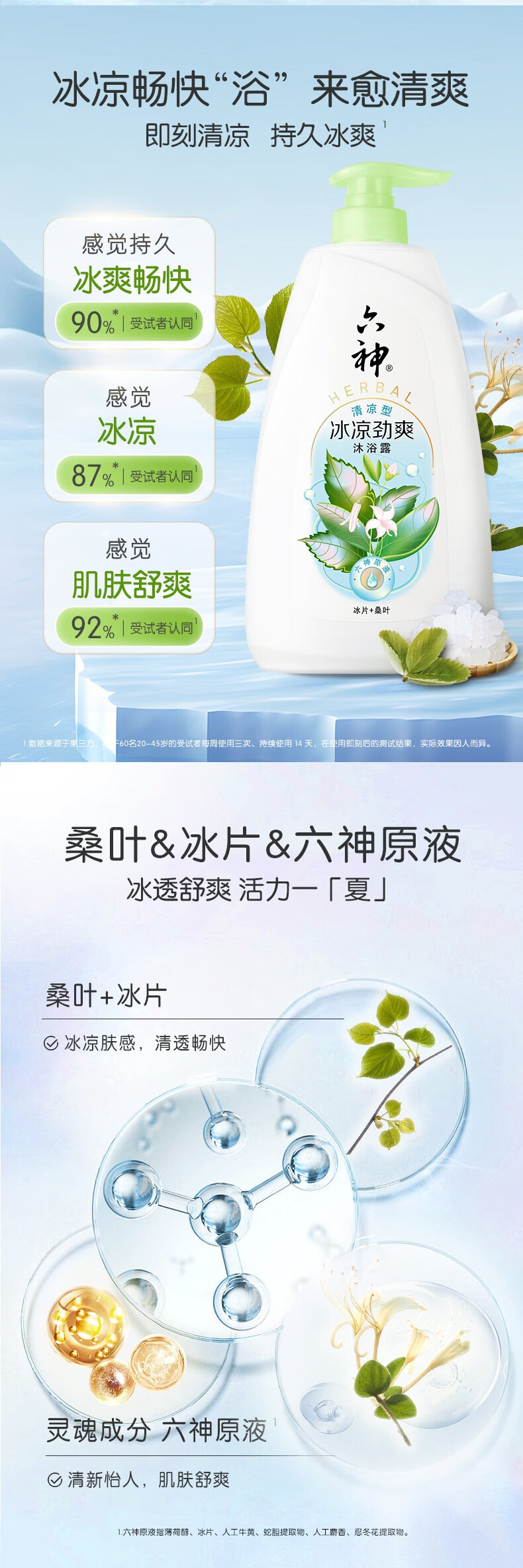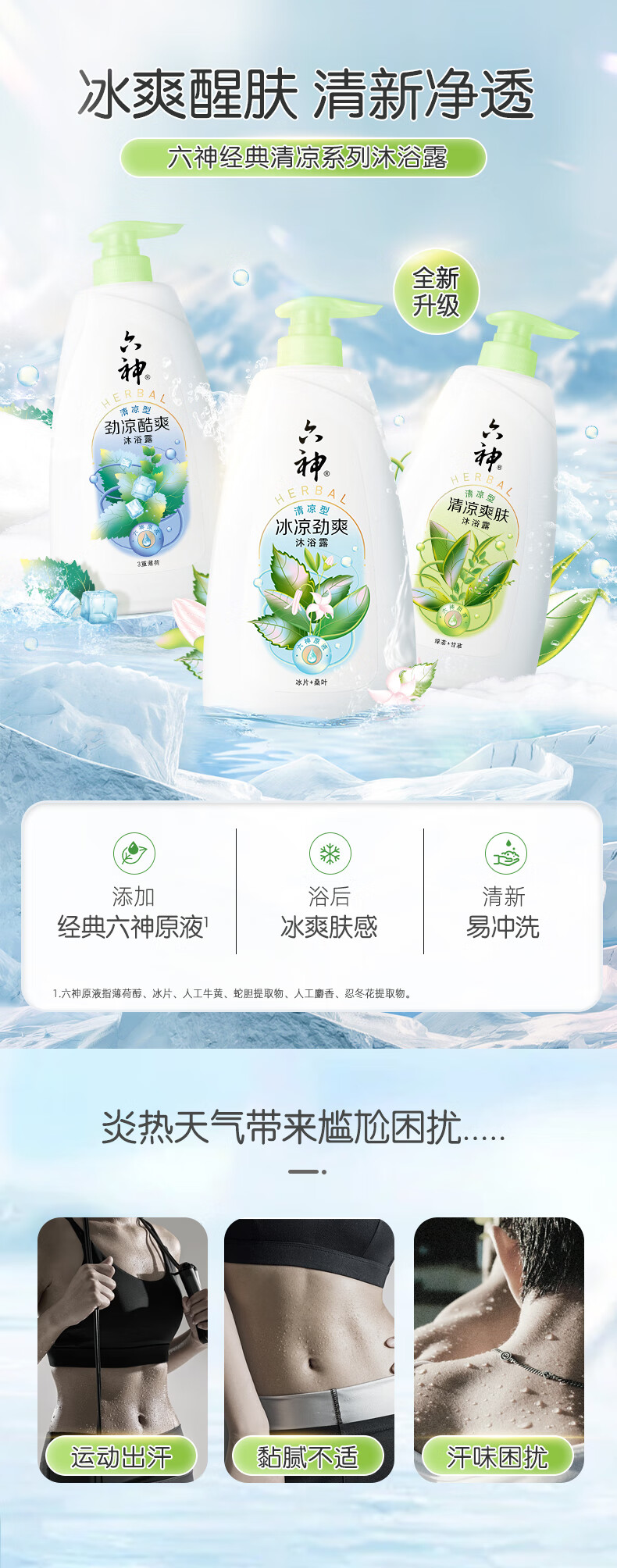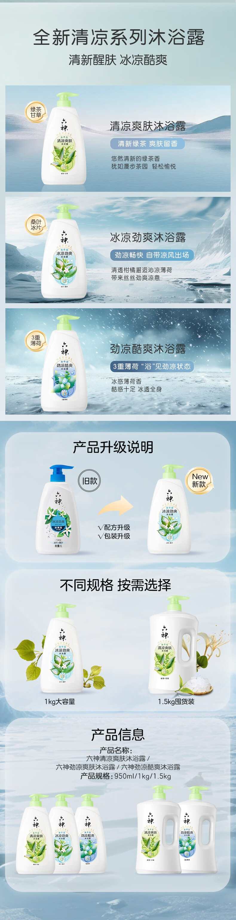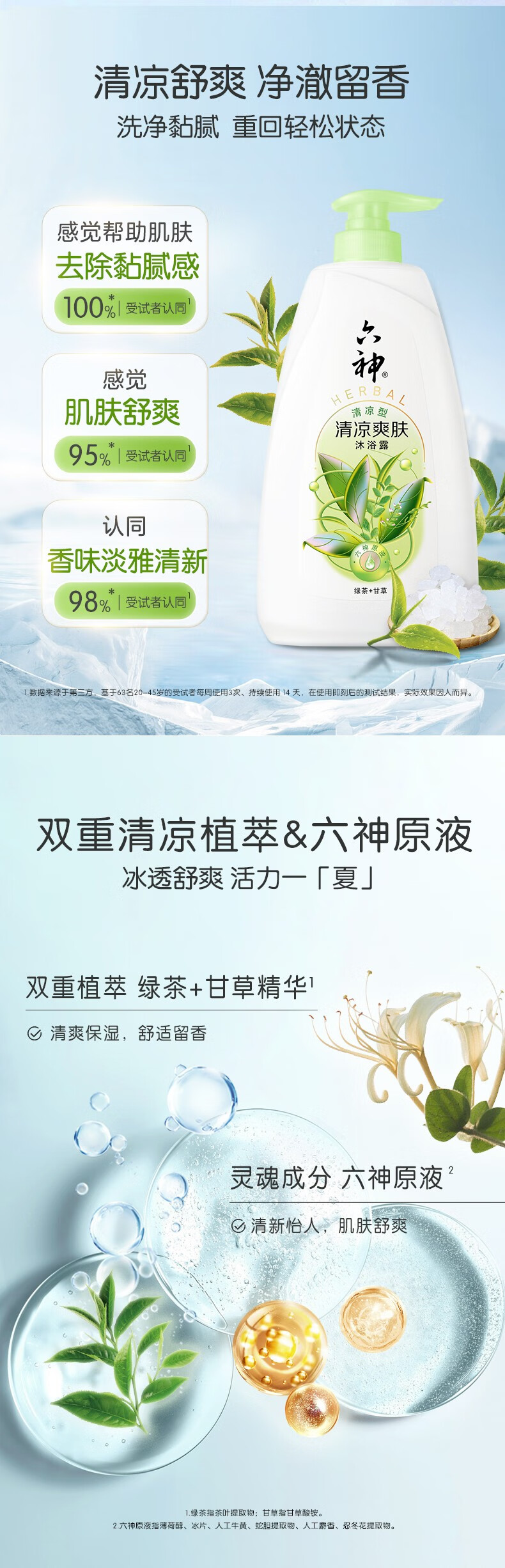 六神沐浴露清凉爽肤加量装1KG+500g绿茶甘草男士女士沐浴露金榜TOP1