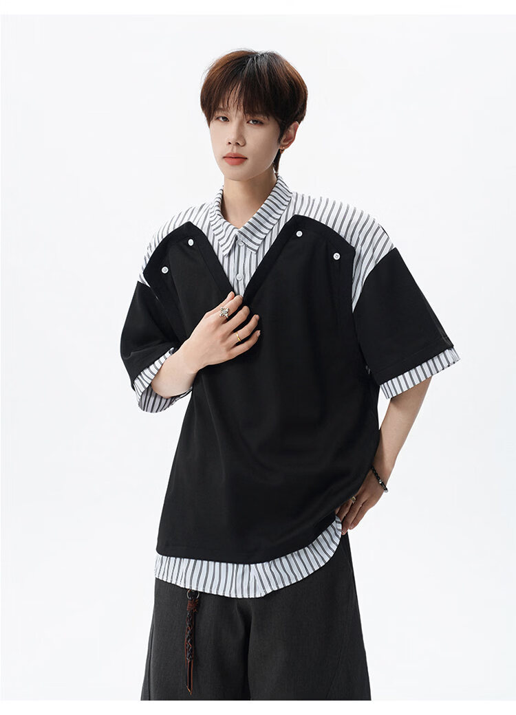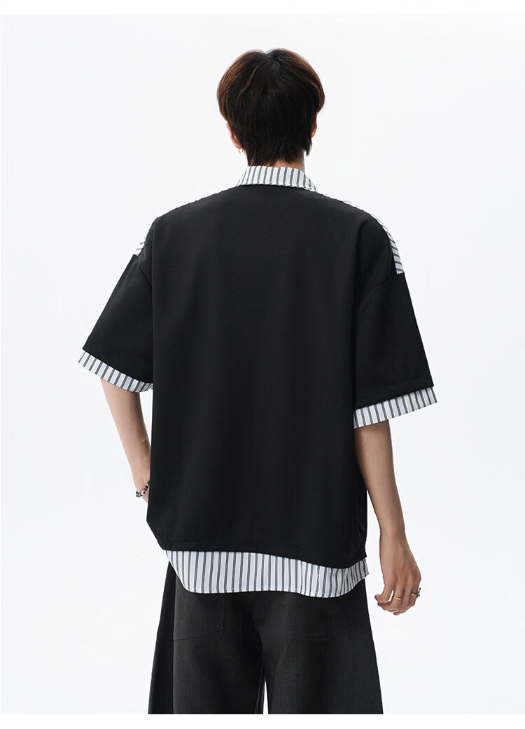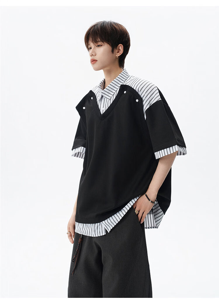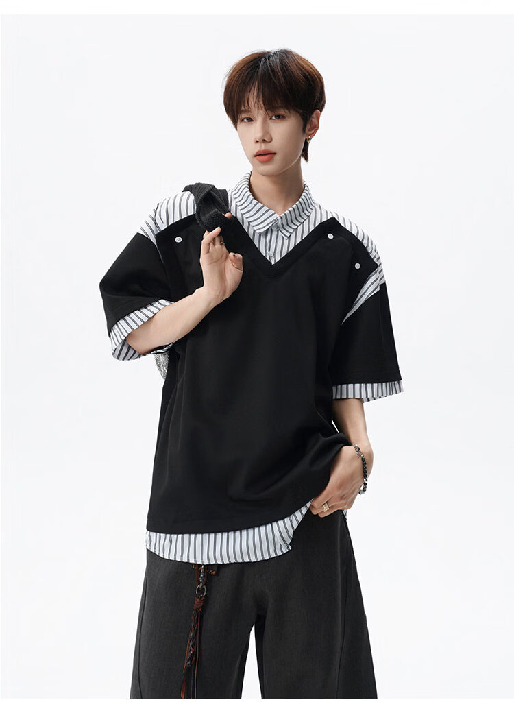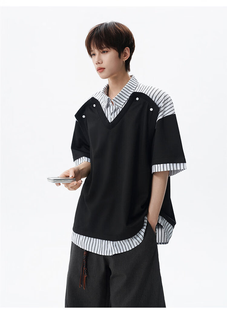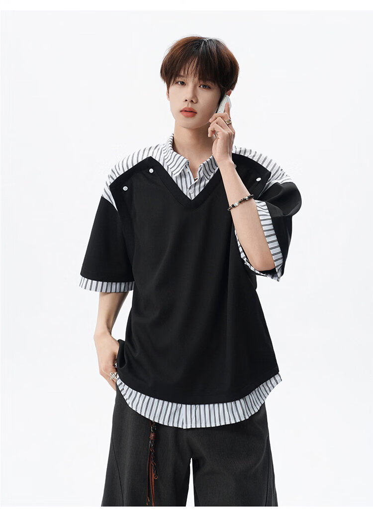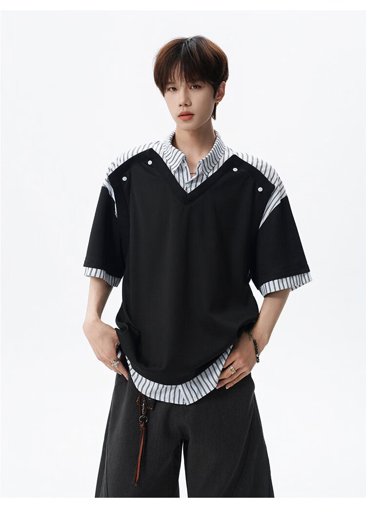 NEW OR MODE学院风短袖polo衫男士夏季新款条纹拼接撞色t恤百搭休闲半袖衬衫 黑色【高品质】 M 【建议90-110斤】