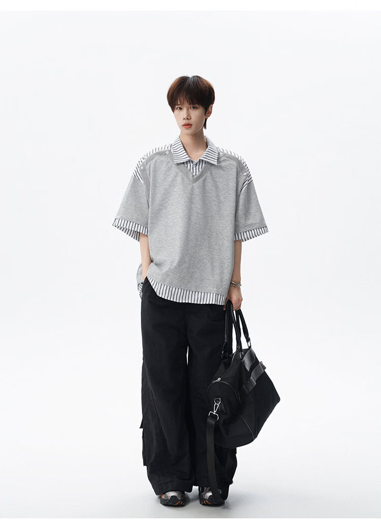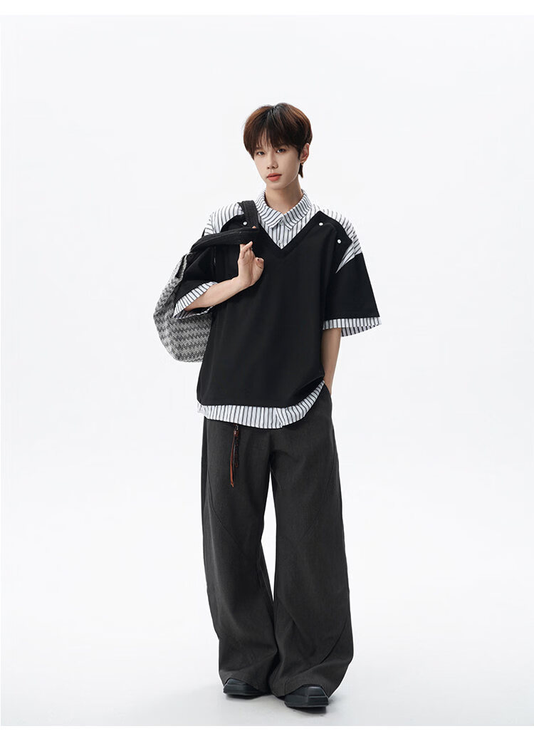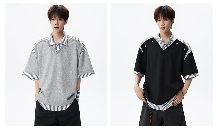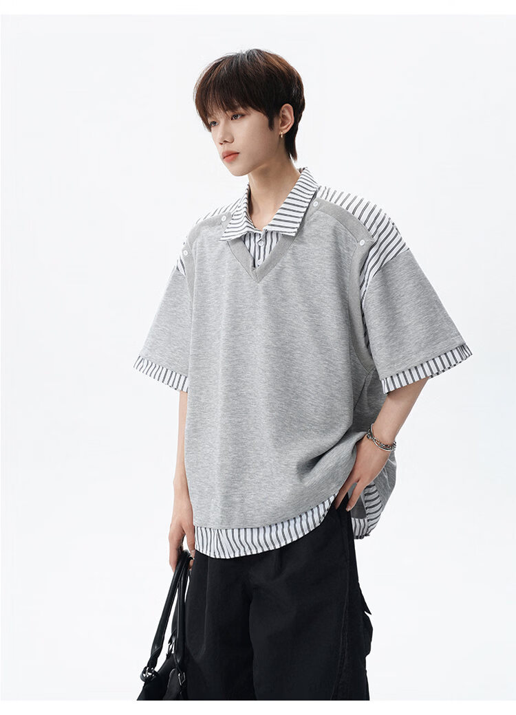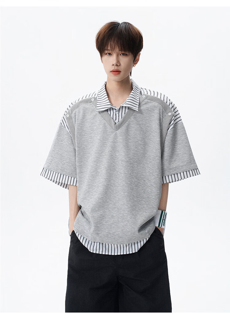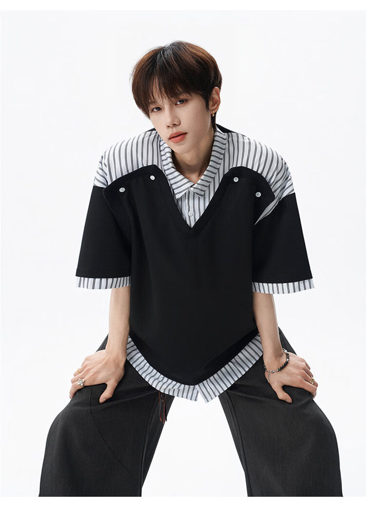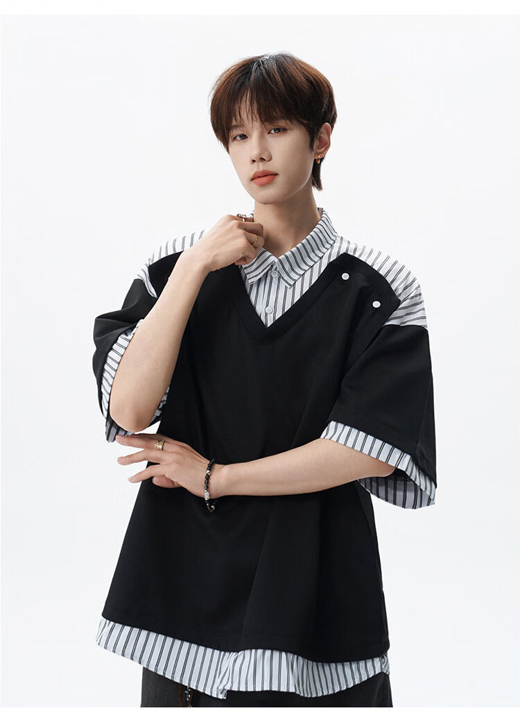 NEW OR MODE学院风短袖polo衫男士夏季新款条纹拼接撞色t恤百搭休闲半袖衬衫 黑色【高品质】 M 【建议90-110斤】