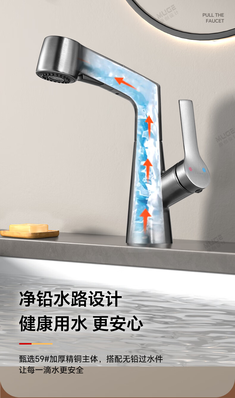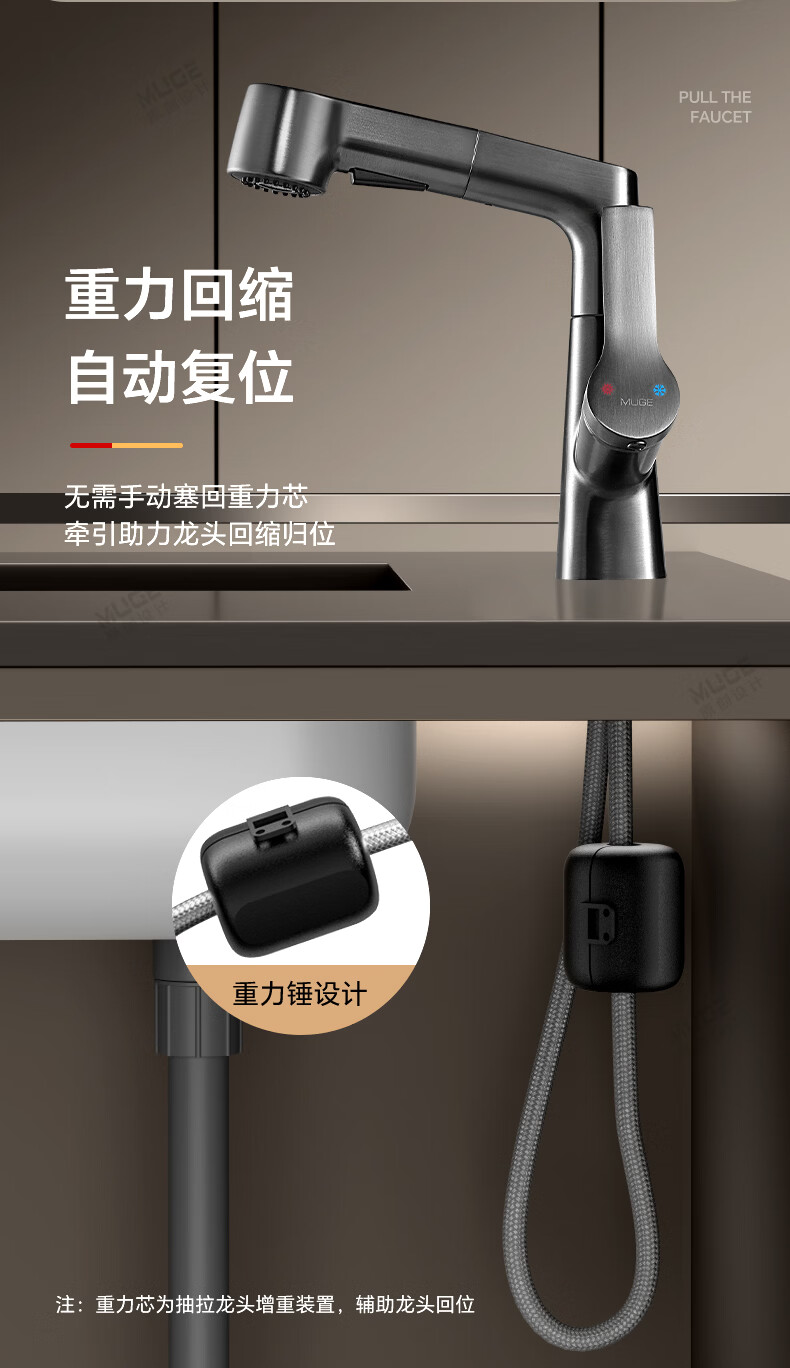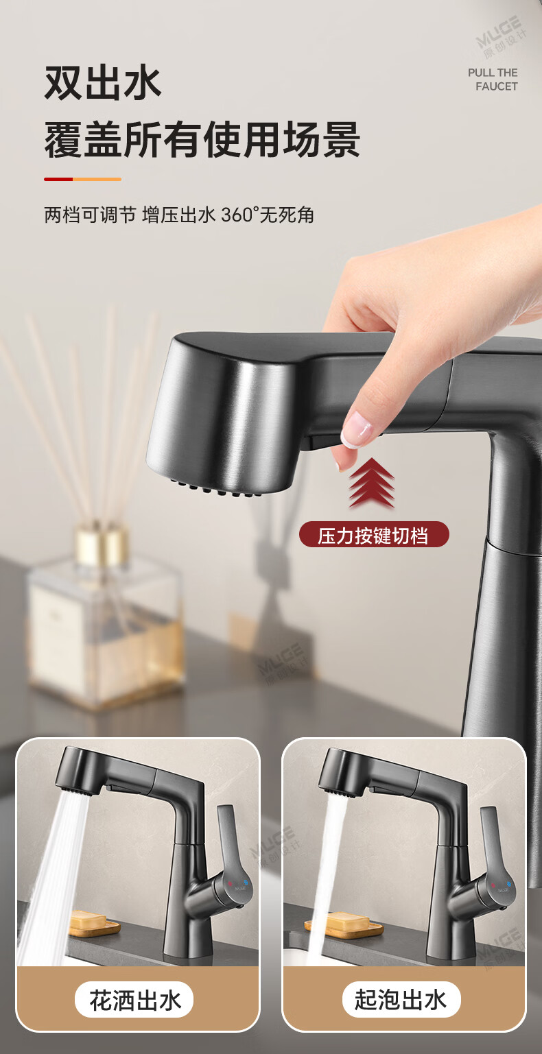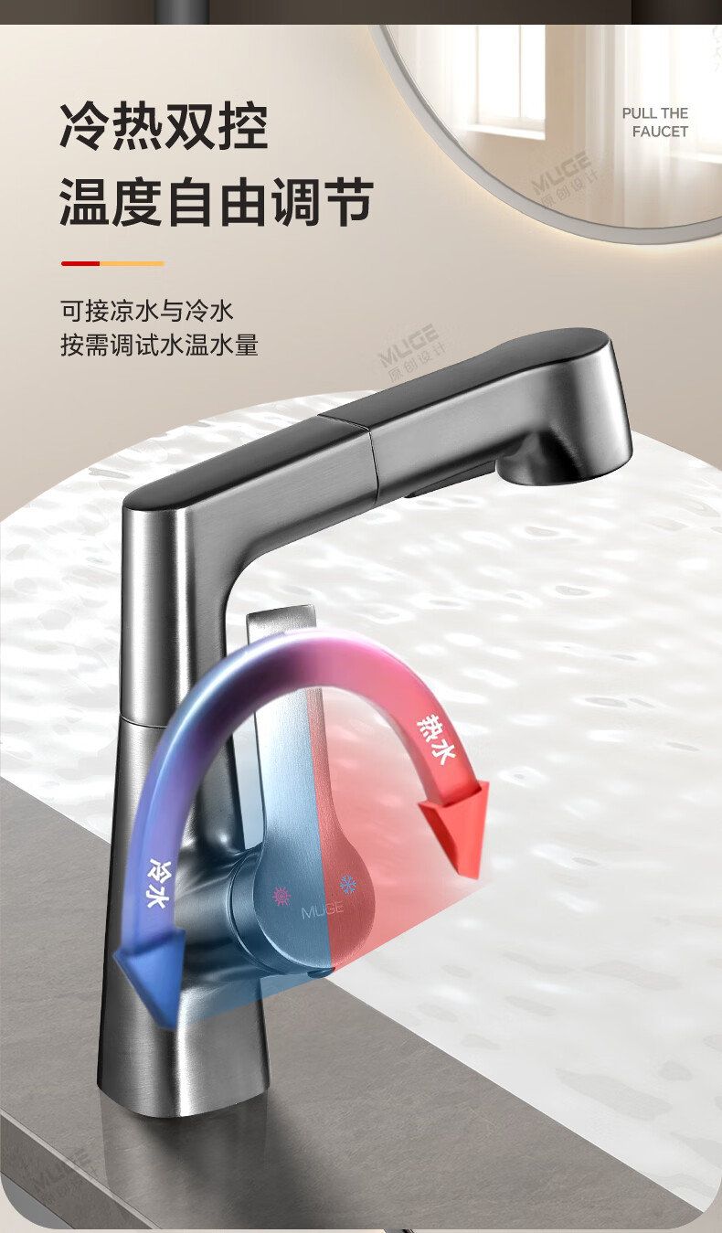 睦歌(MUGE)卫生间面盆洗手盆水龙头冷热抽拉洗脸盆洗手池洗漱台浴室柜水龙头 精铜加厚【珍珠白】两档抽拉升降面盆龙头 赠送原装80cm冷热水管