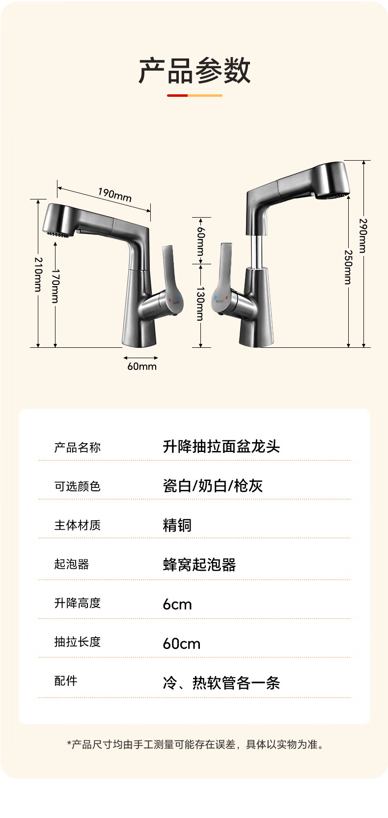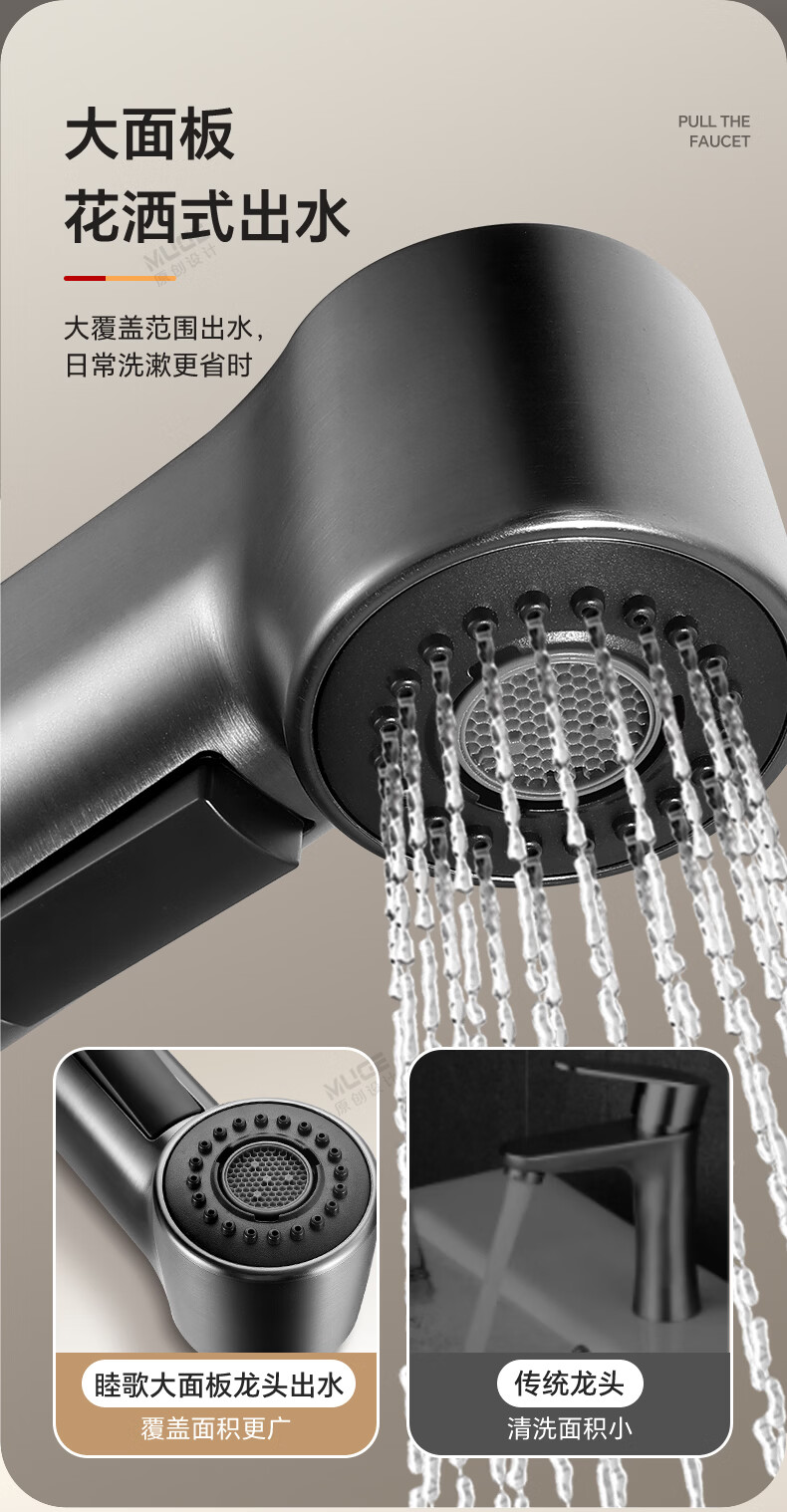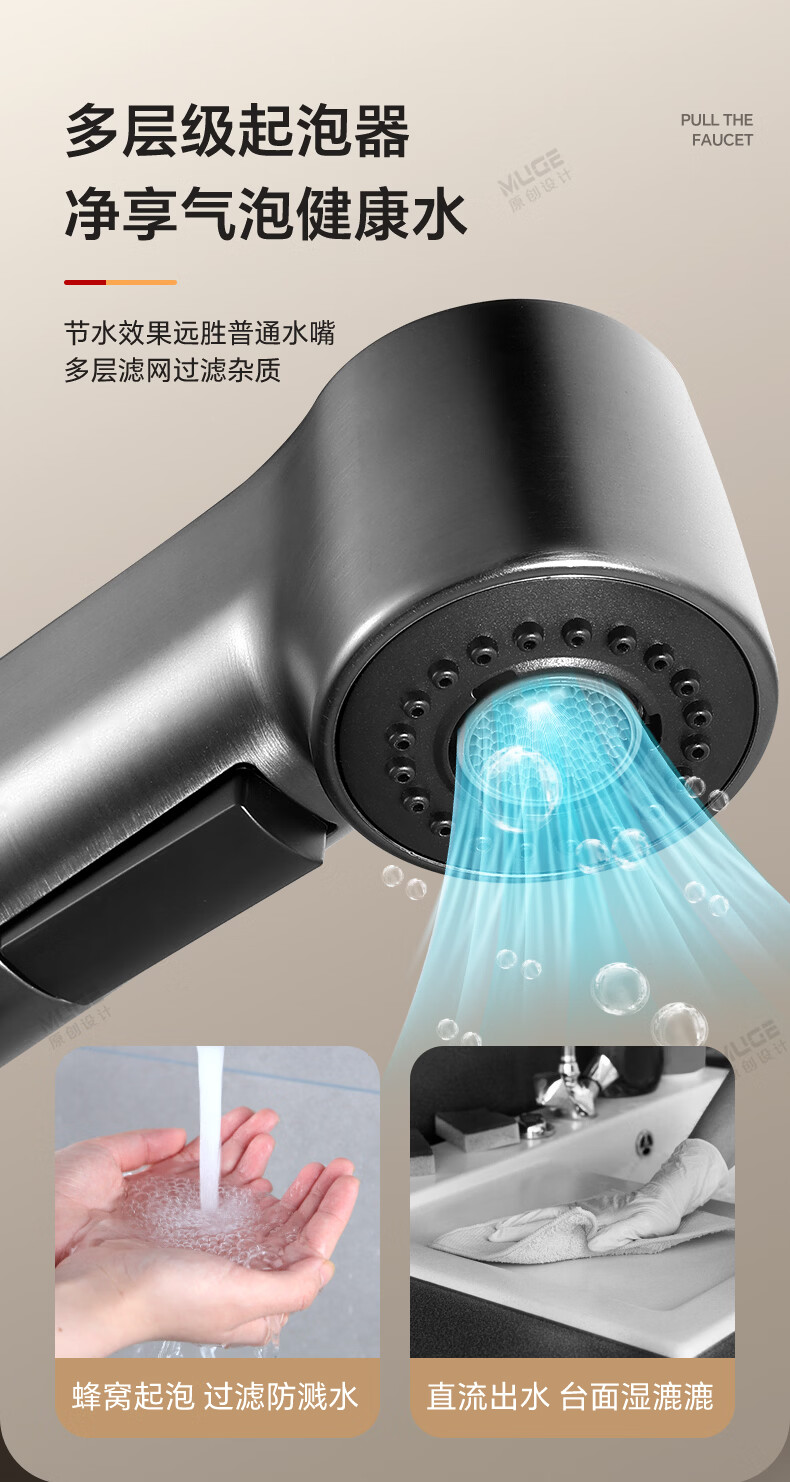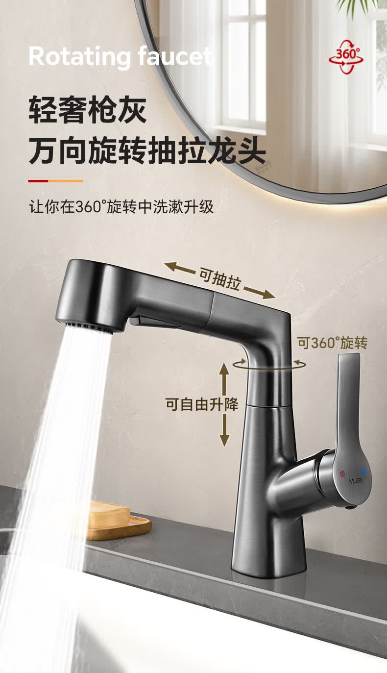 睦歌(MUGE)卫生间面盆洗手盆水龙头冷热抽拉洗脸盆洗手池洗漱台浴室柜水龙头 精铜加厚【珍珠白】两档抽拉升降面盆龙头 赠送原装80cm冷热水管