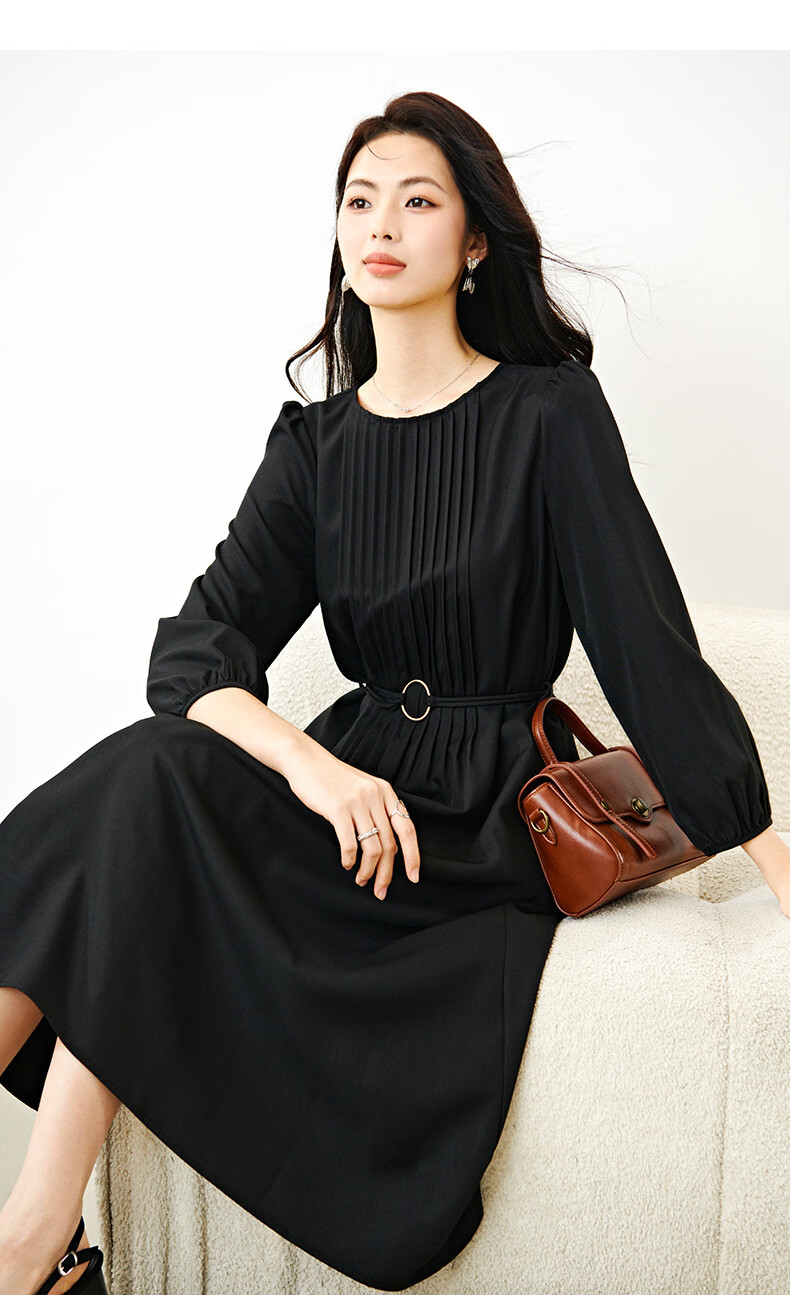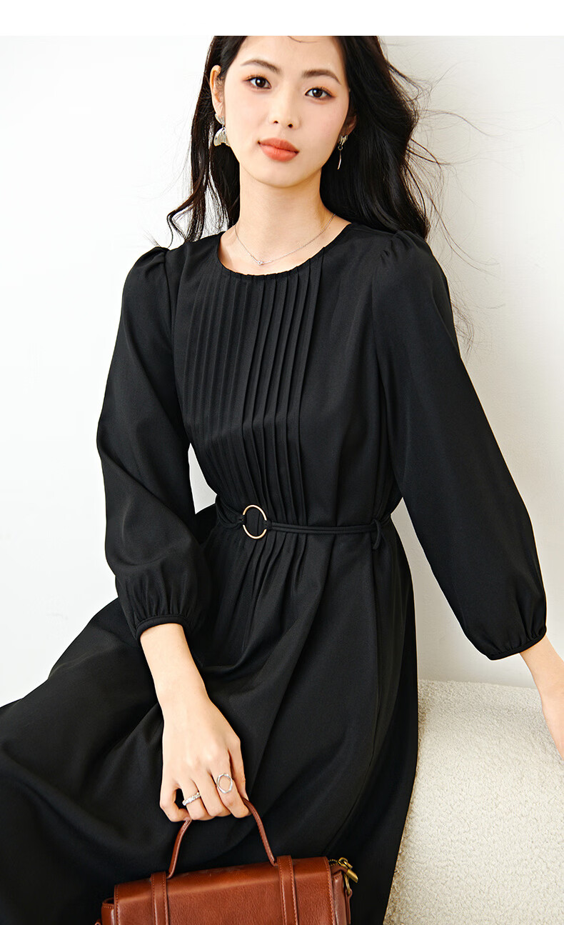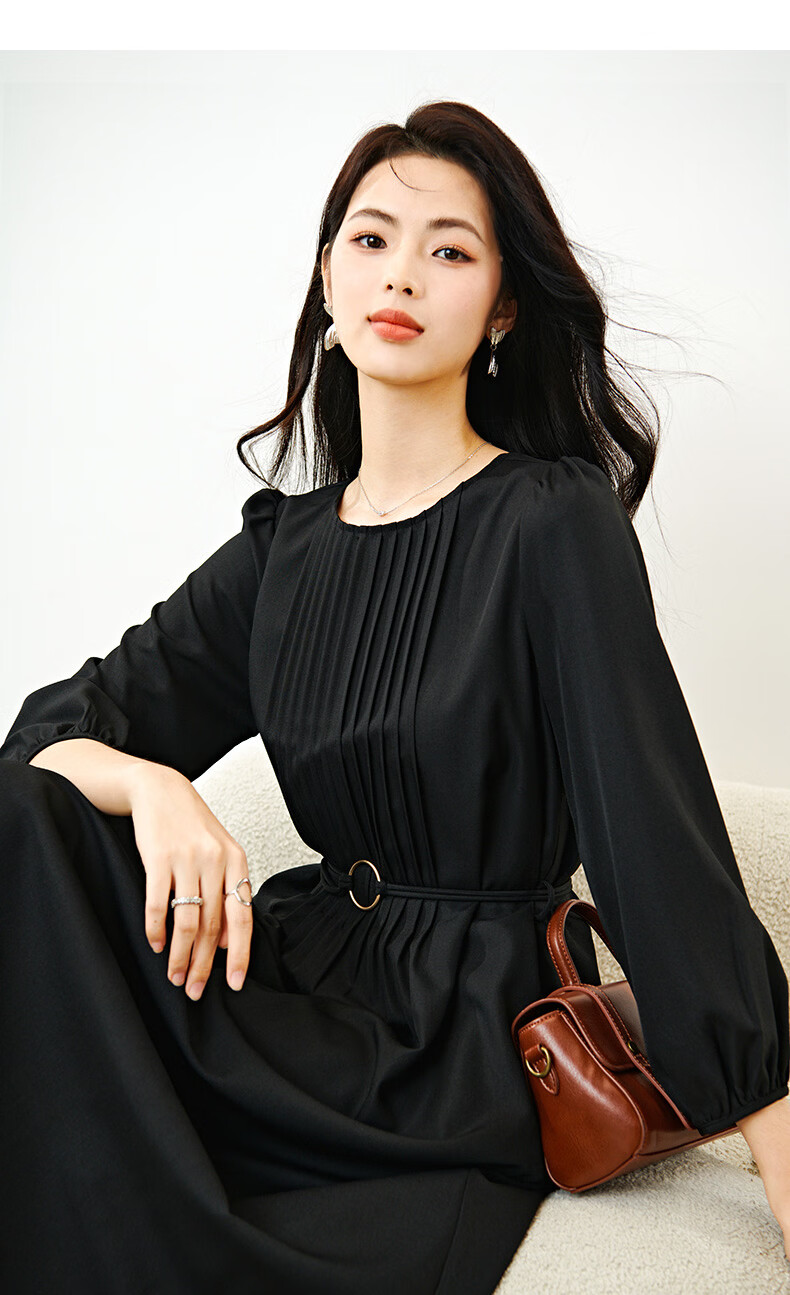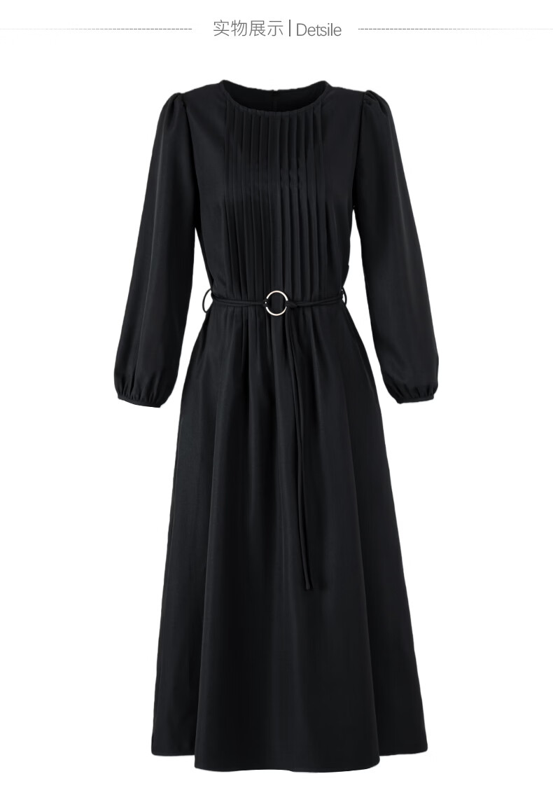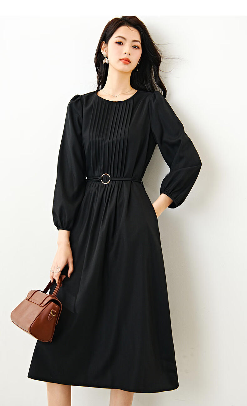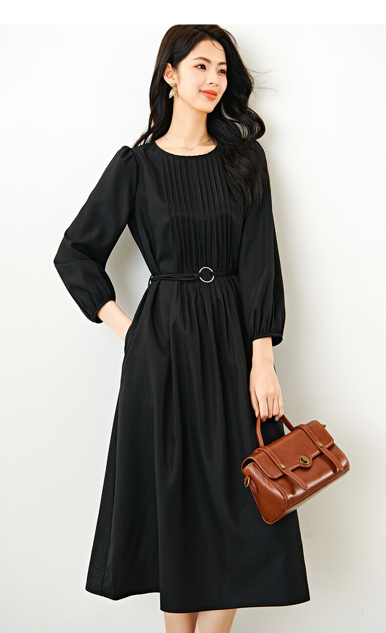 晚白2026年春款气质圆领大摆风琴褶裙子系带收腰显瘦利落通勤连衣裙 黑色 L