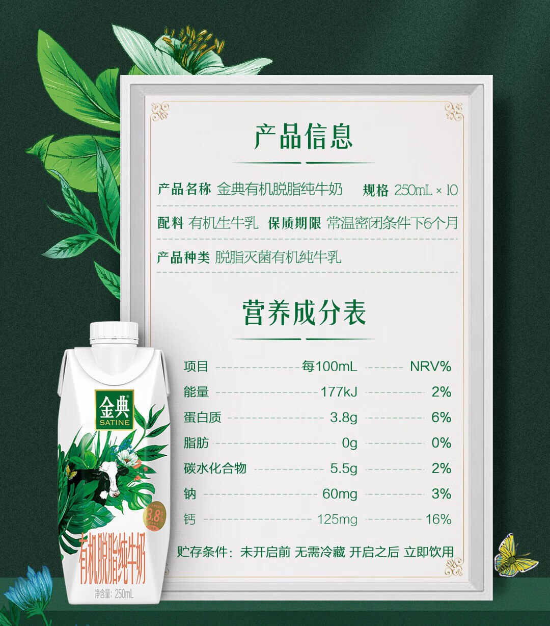 伊利金典有机脱脂纯牛奶250ml*10盒/箱 0脂轻负担