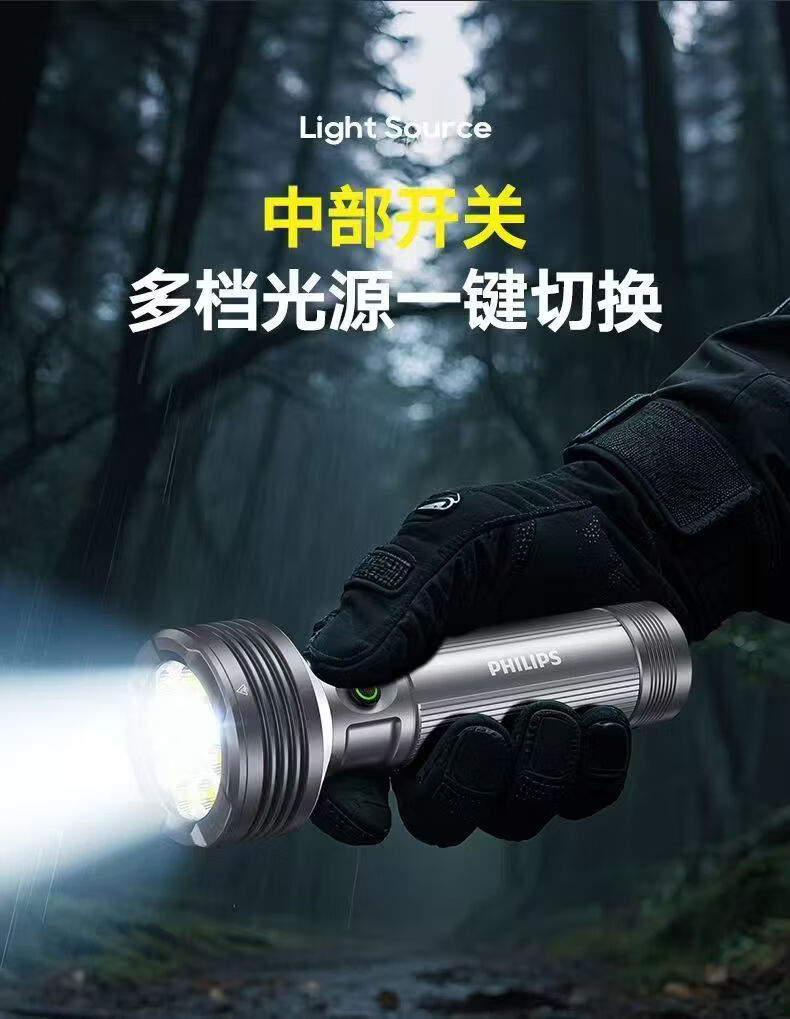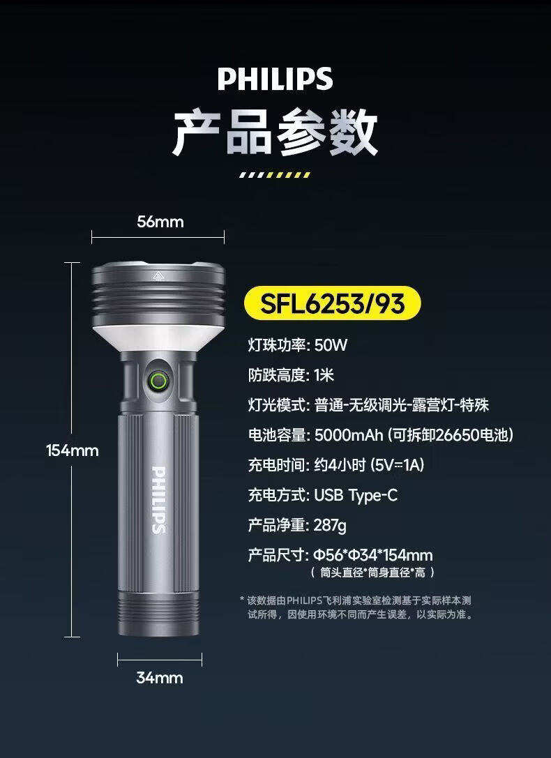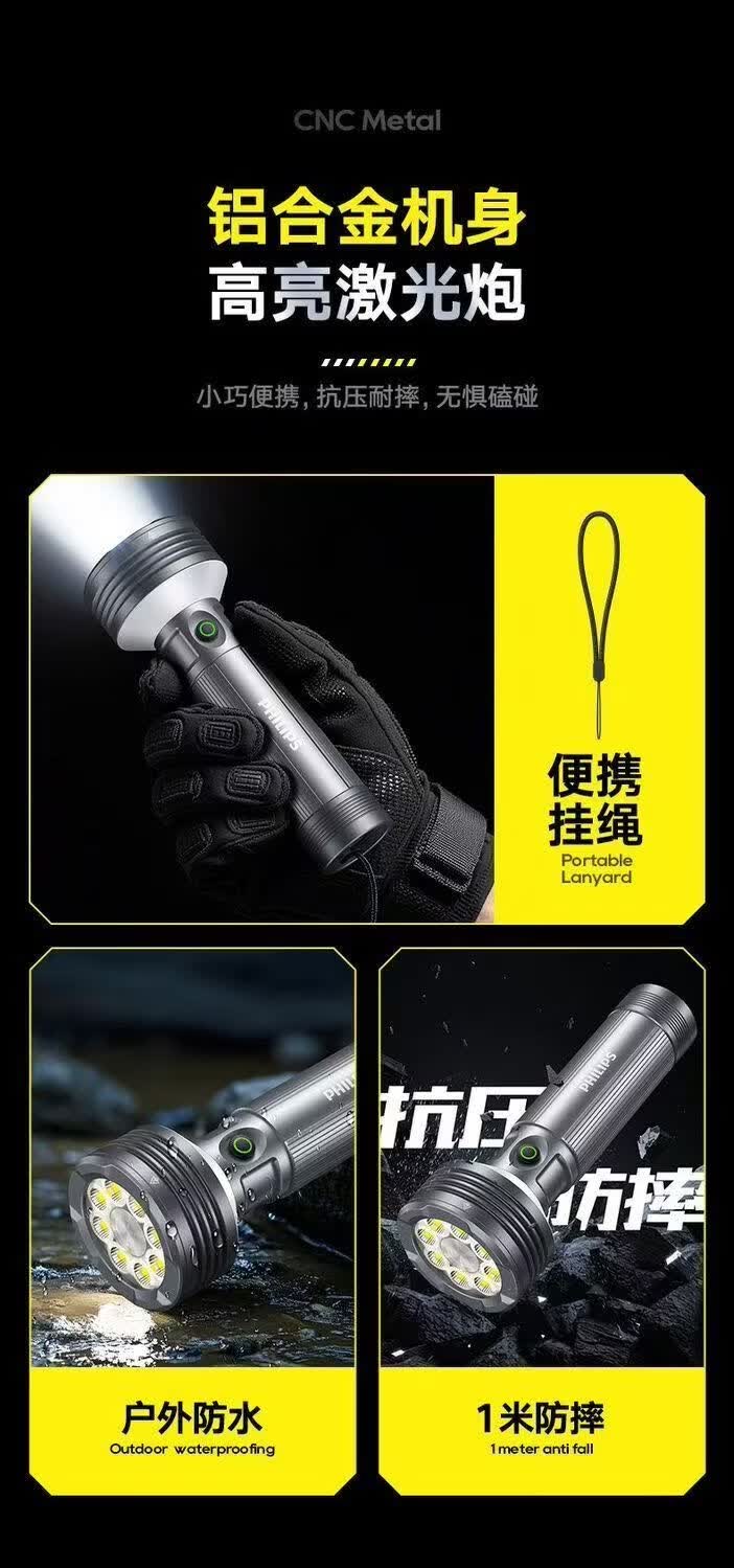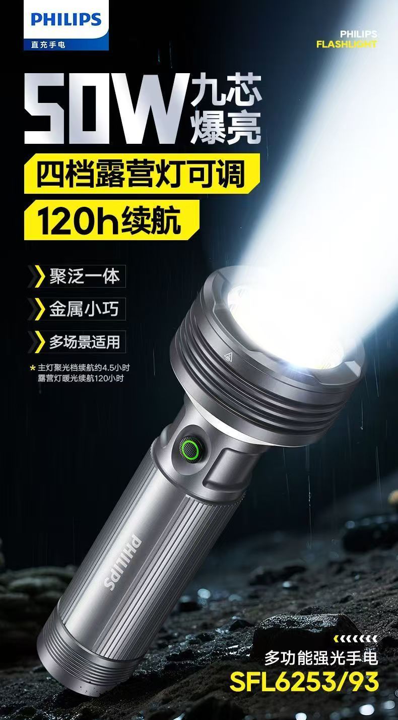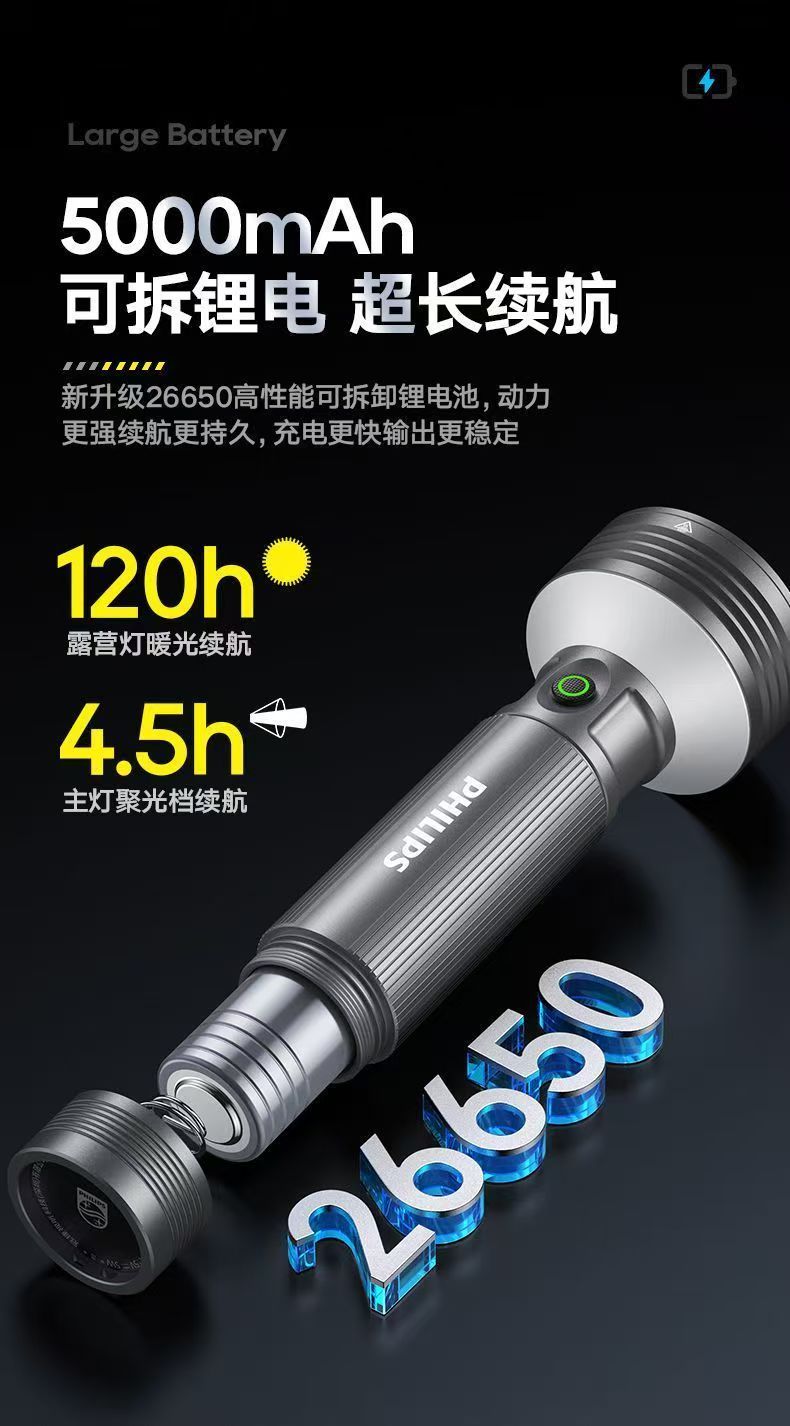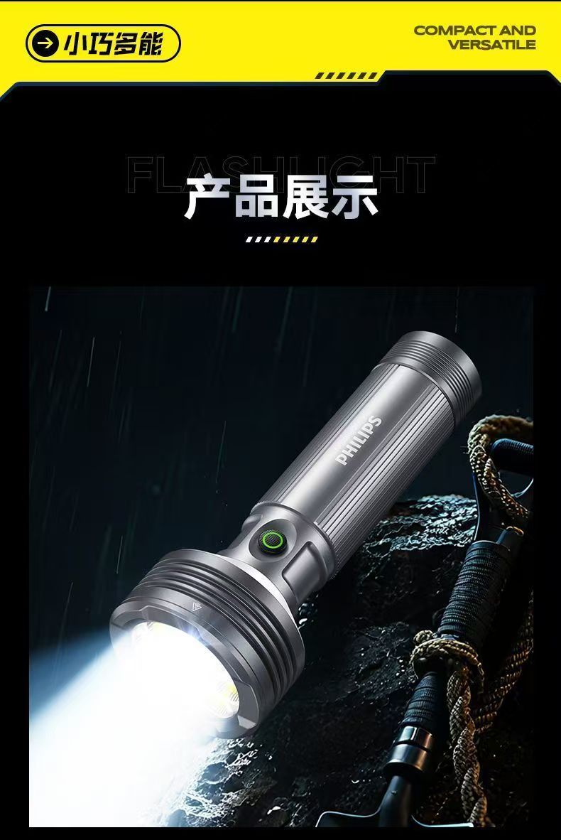 飞利浦(PHILIPS)强光手电筒远射投远近射泛光变焦高亮续航时长便携铝合金可充电户外照明巡逻手电SFL6253 50W/5000毫安/变焦/SFL6253