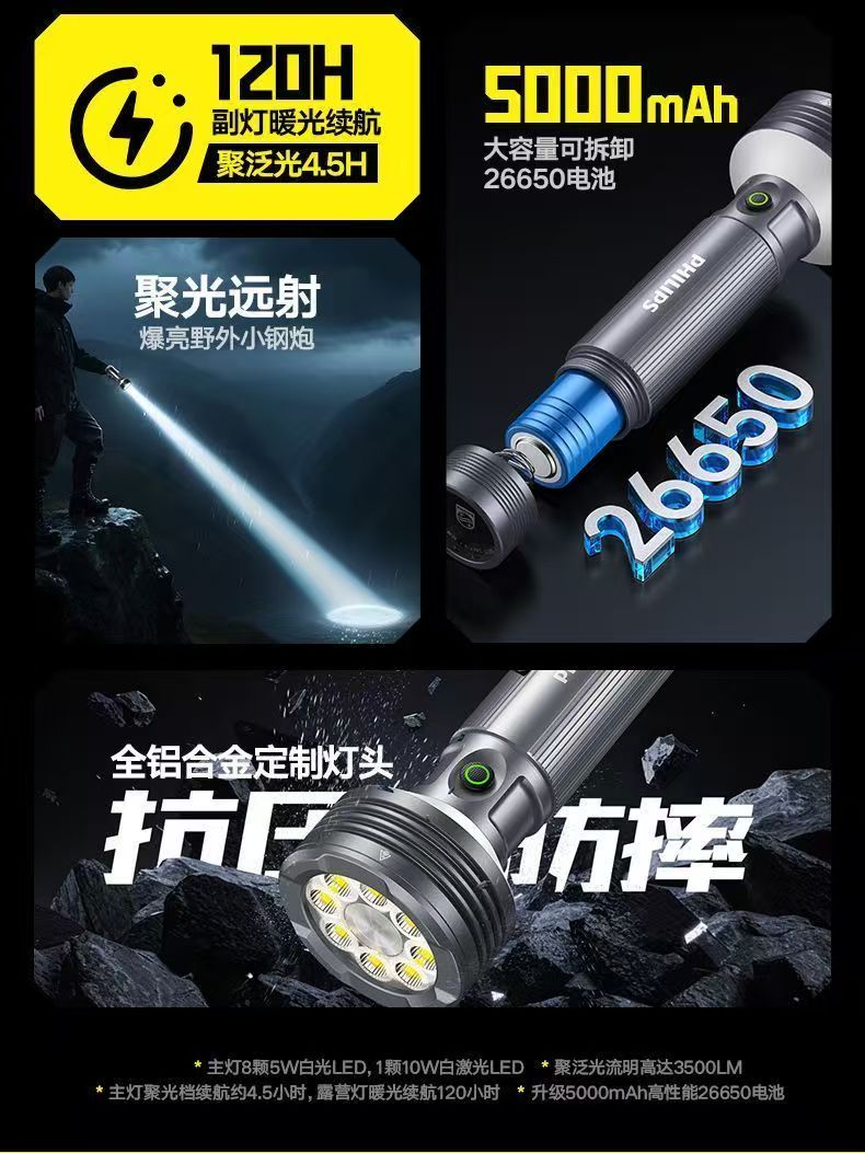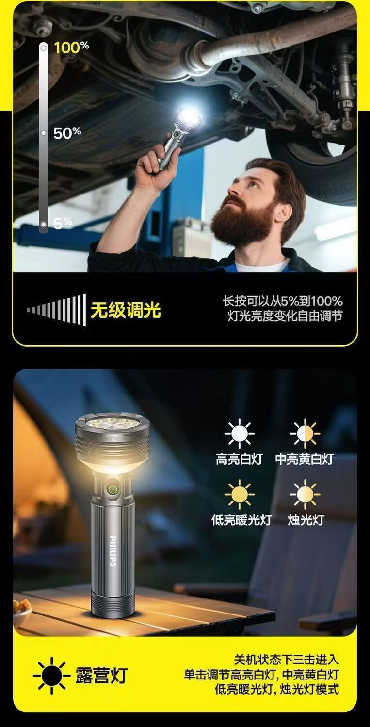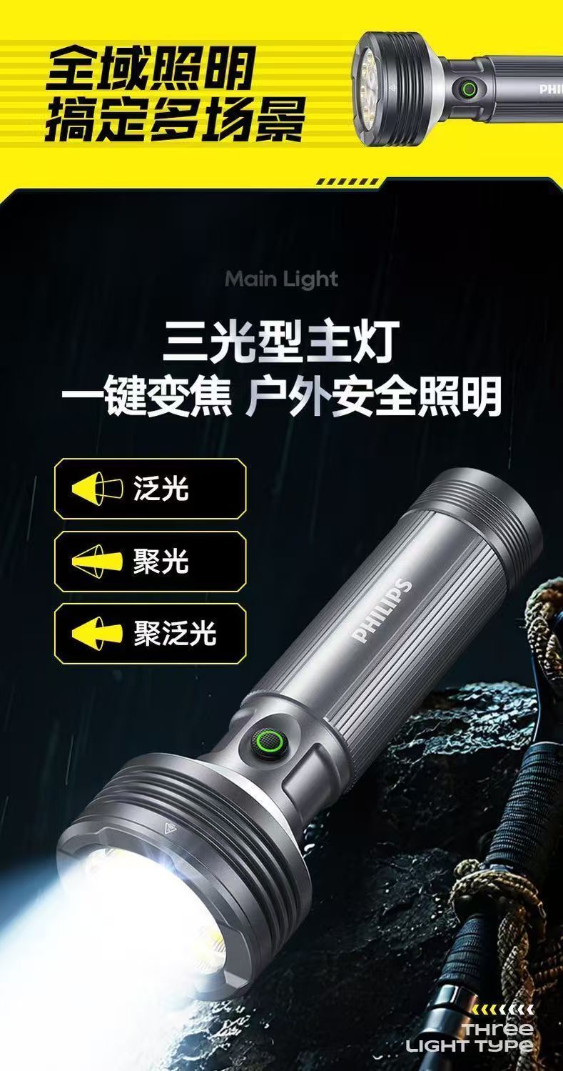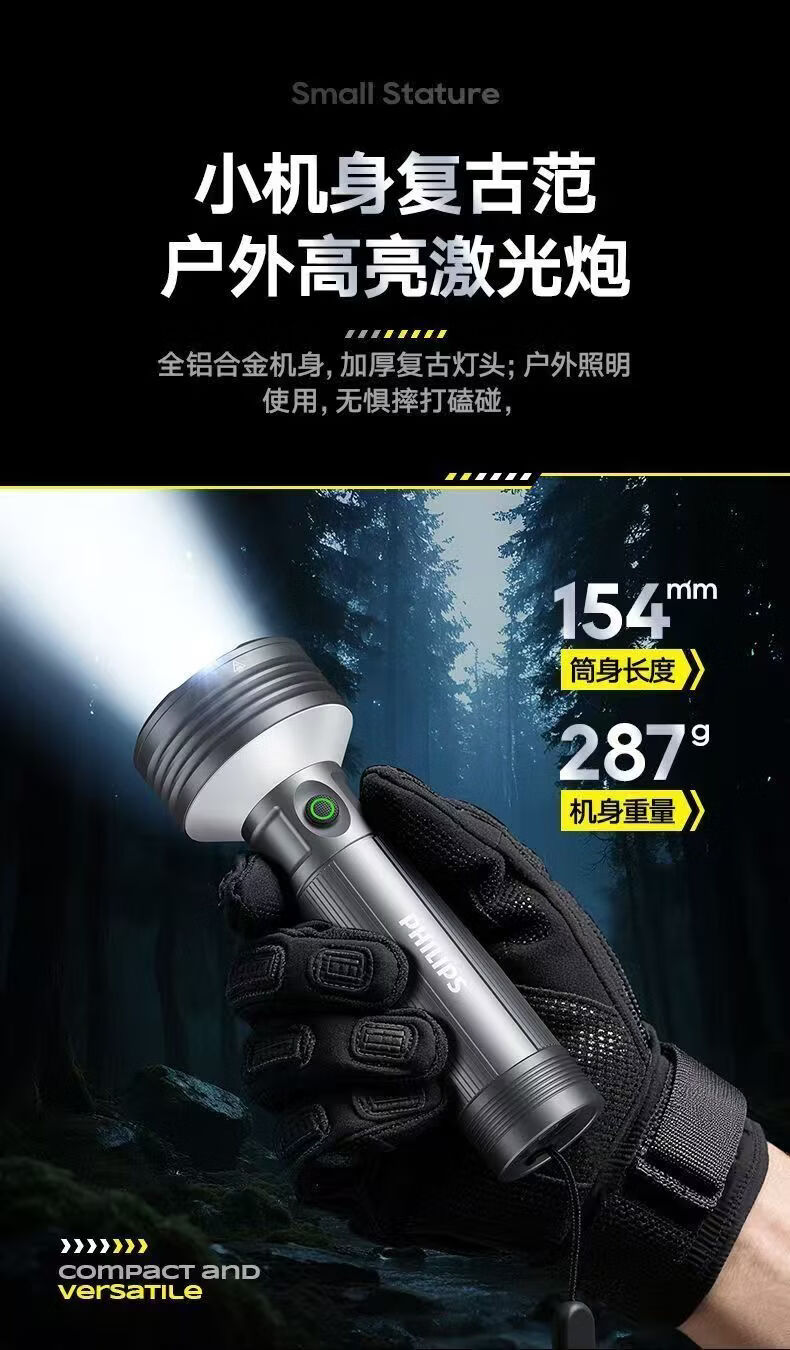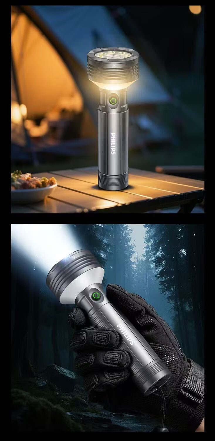 飞利浦(PHILIPS)强光手电筒远射投远近射泛光变焦高亮续航时长便携铝合金可充电户外照明巡逻手电SFL6253 50W/5000毫安/变焦/SFL6253