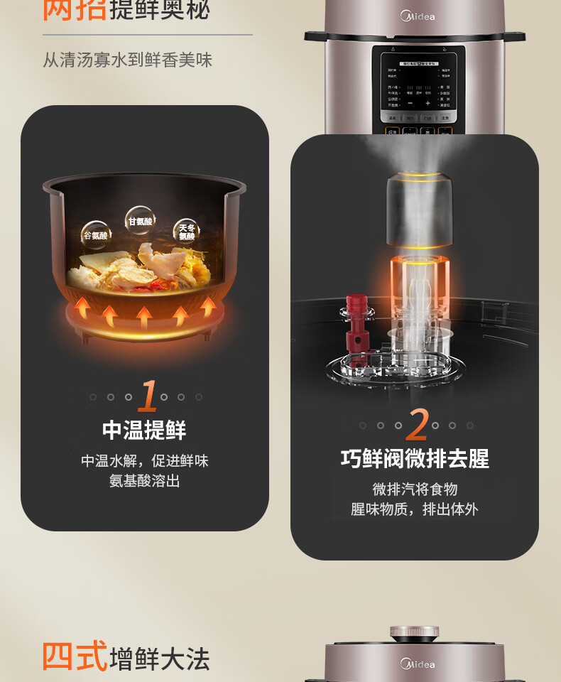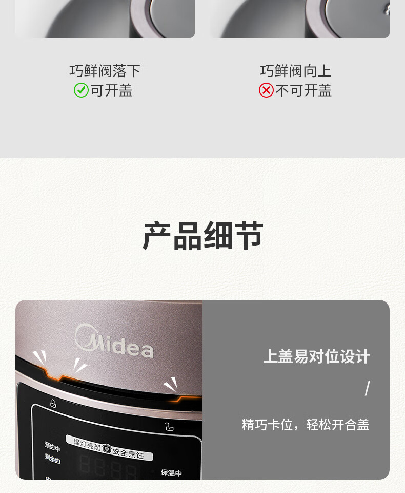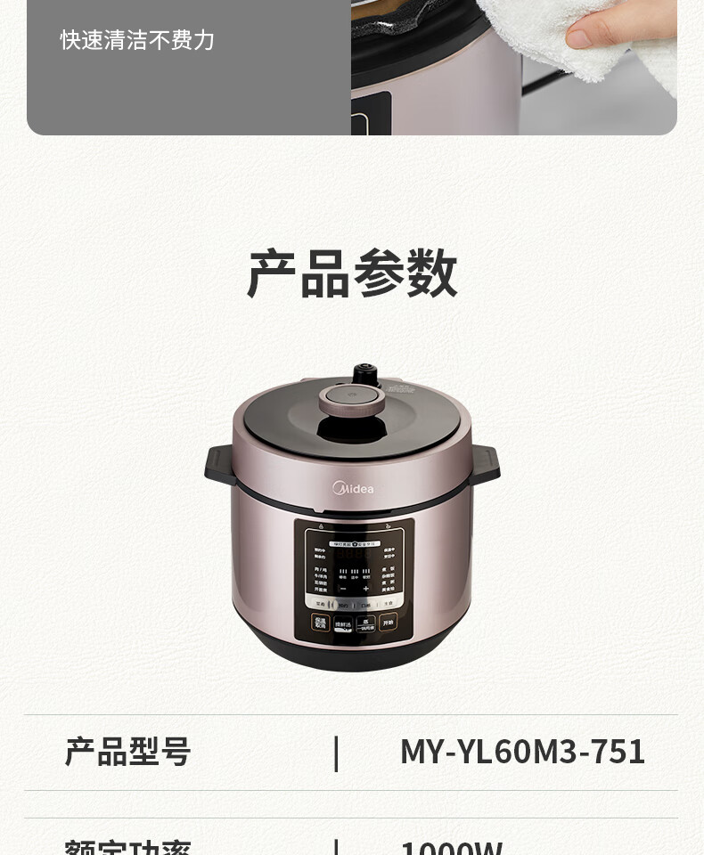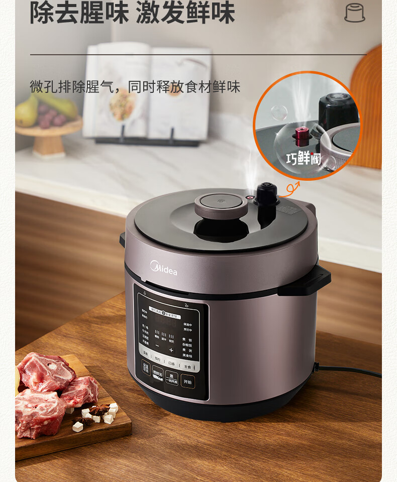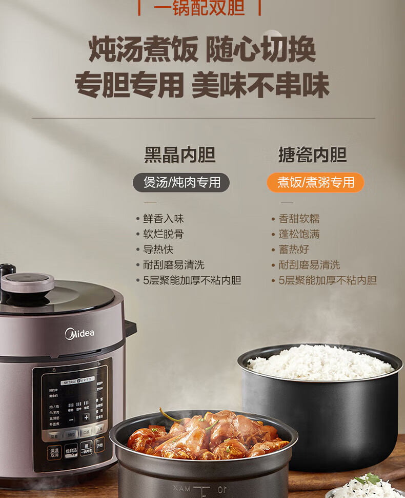 美的(Midea)电压力锅6升大容量家用高压锅提鲜一锅双胆煮饭锅多功能不粘智能预约煲汤一键排气带蒸笼上蒸下煮