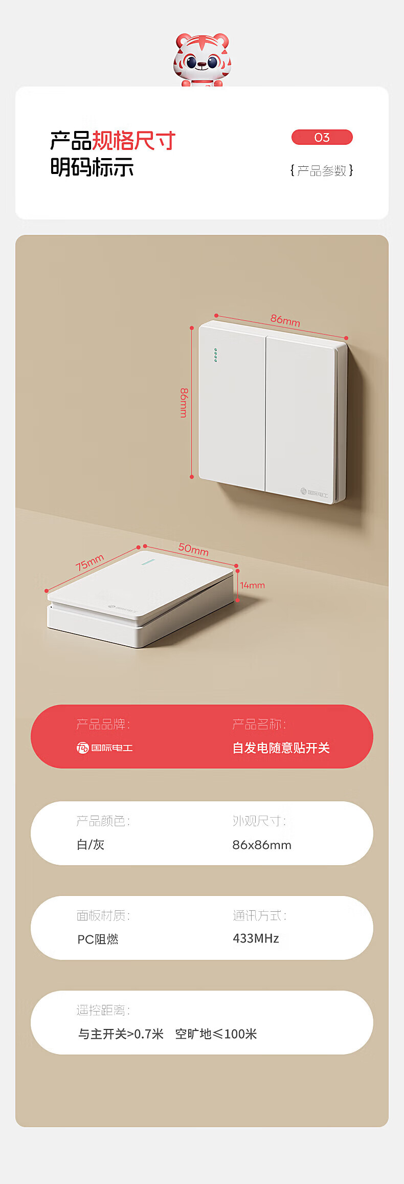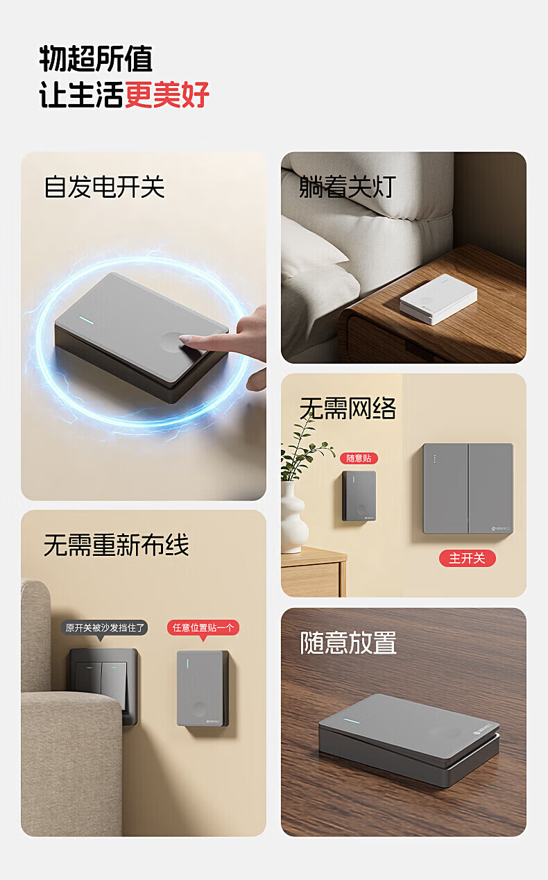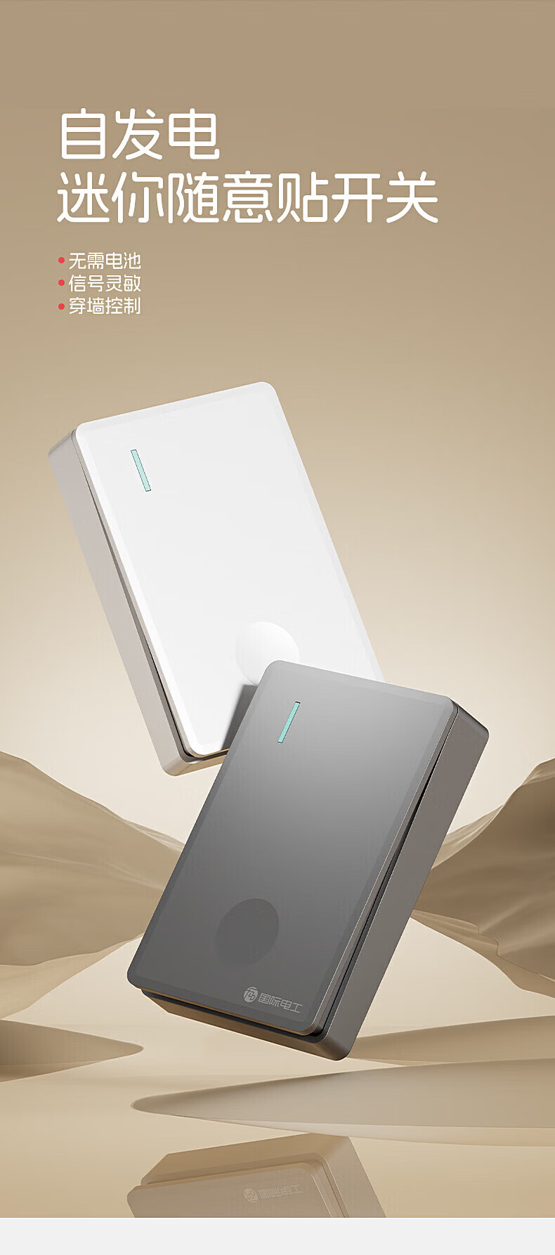 国际电工无线遥控智能双控子母开关家用远程免布线自发电迷你随意贴面板 灰色一开主机*1+迷你随意贴*1