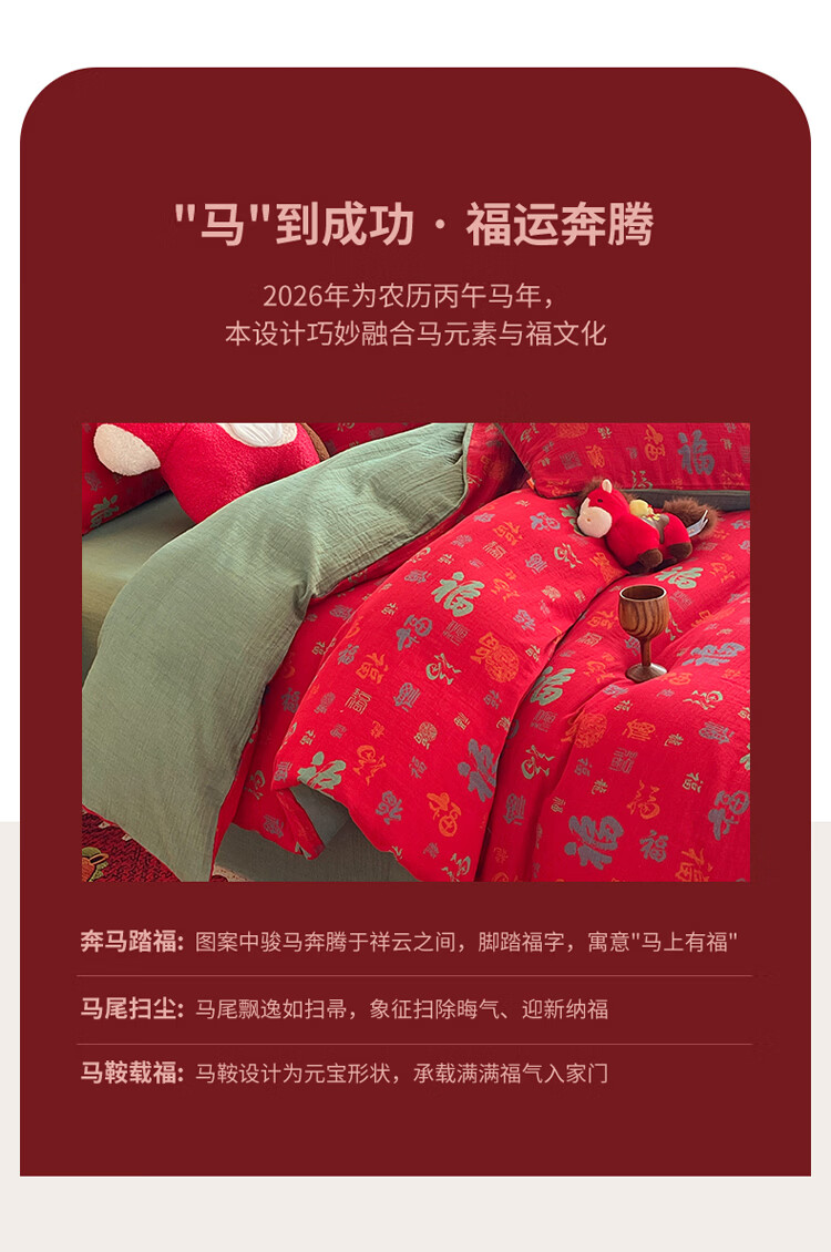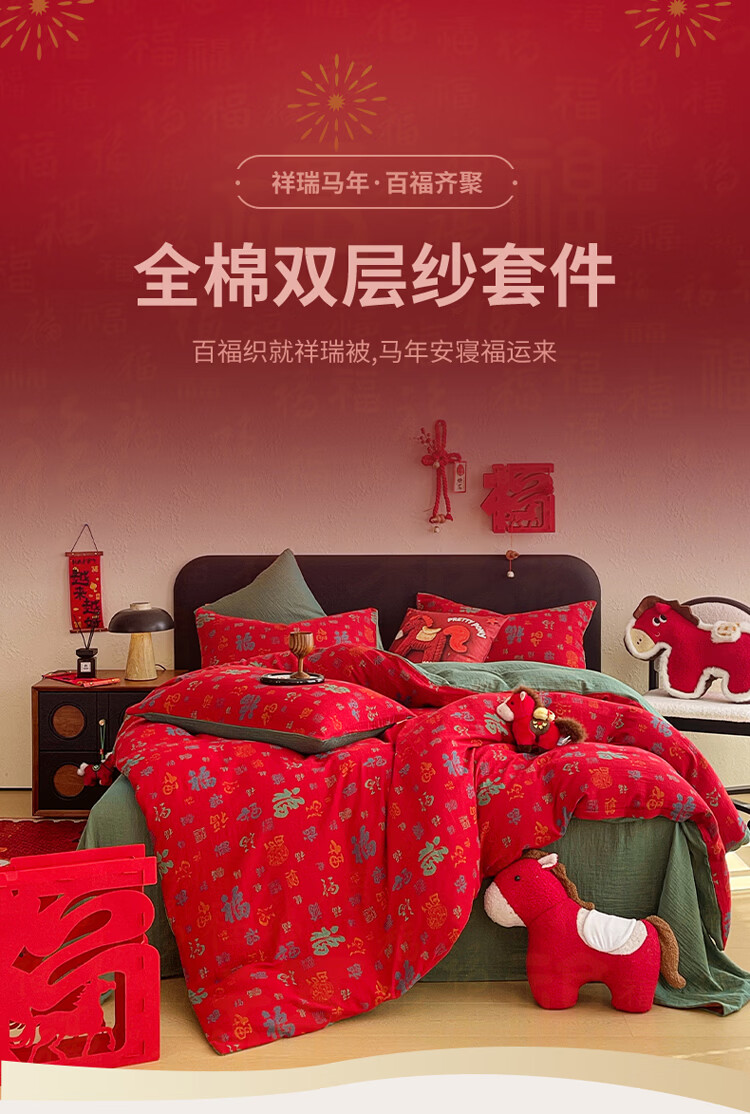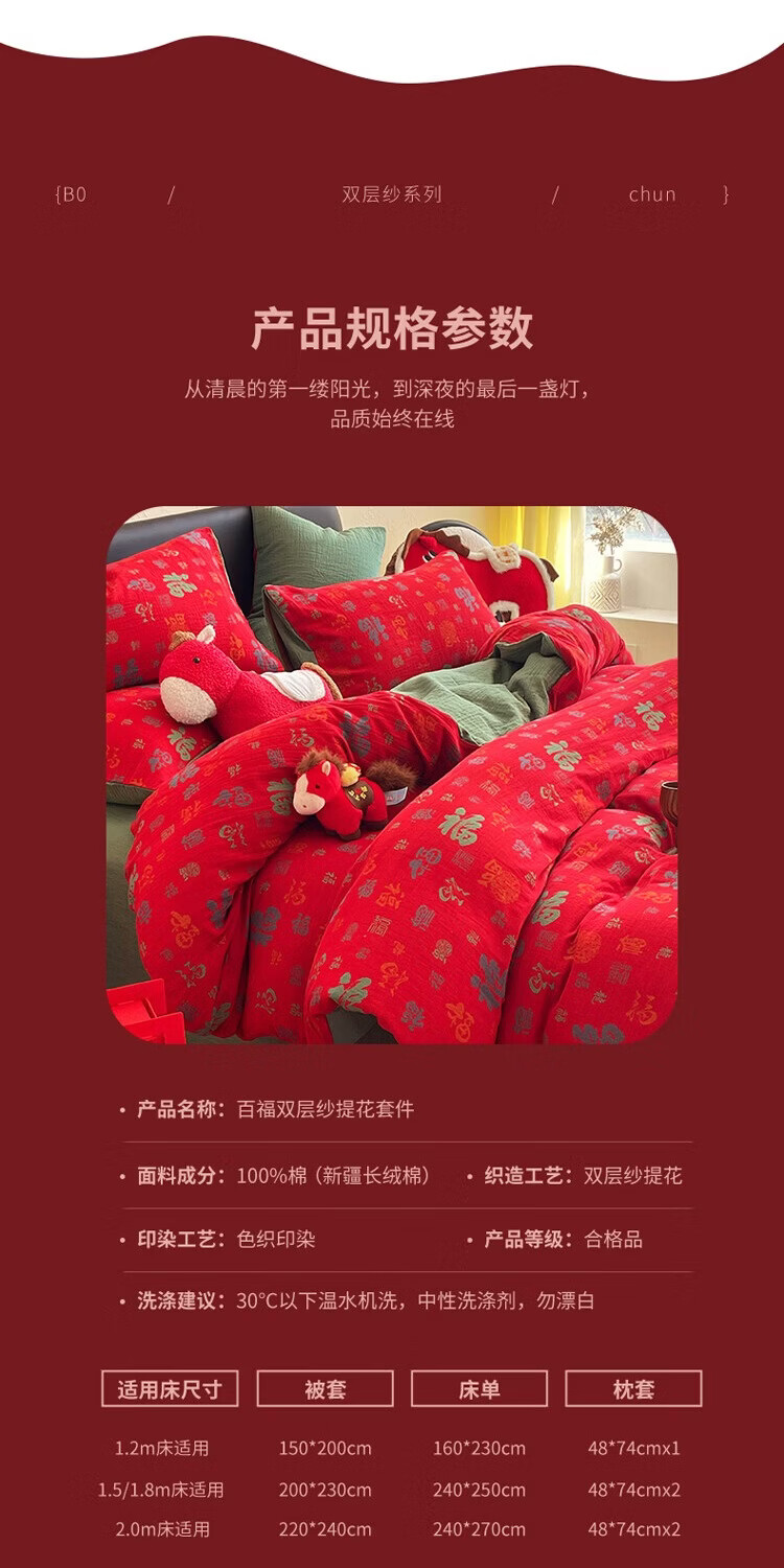 ROLAND LIVE马年限定全棉色织双层纱提花百福四件套马上送福被套床单三件套 CW 百福双层纱套件-红百福 1.2米床 床单款 【被套150*200cm】