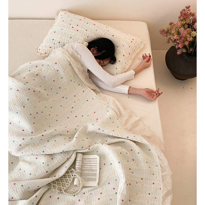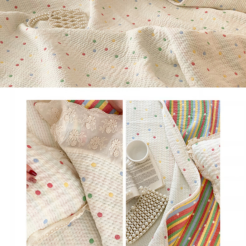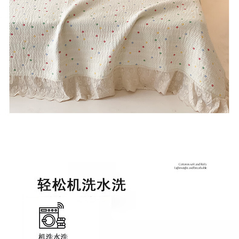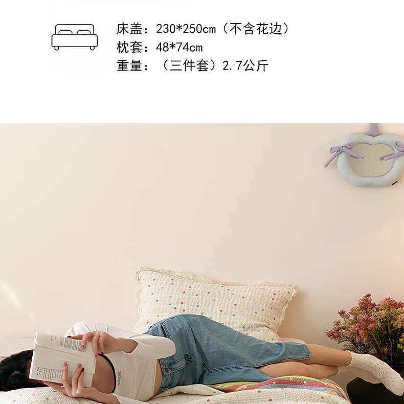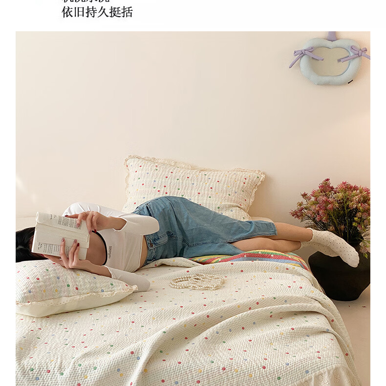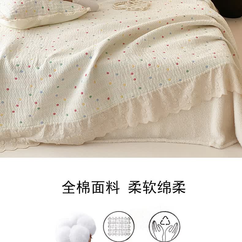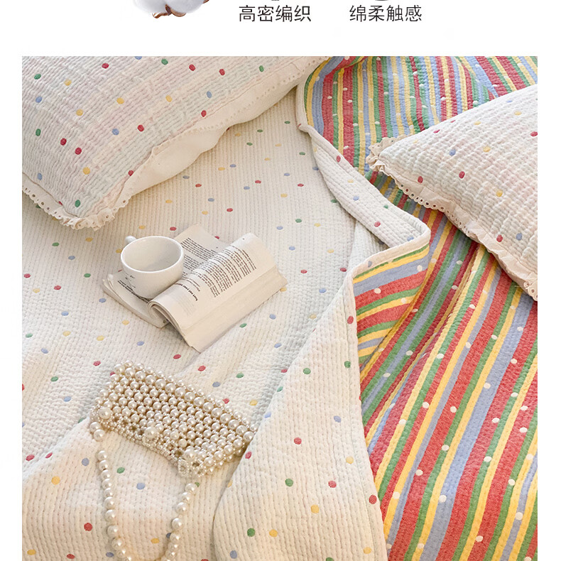无印良品ins韩系全棉纱布床单1.8x2米床纯棉100%四季裸睡夹棉床盖单件家用 奶油波点-灰【色织花边工艺】 三件套: 250cm*230cm 床盖+枕套*2
