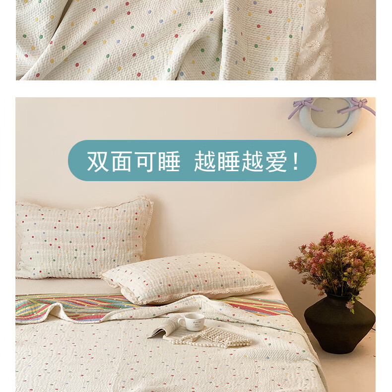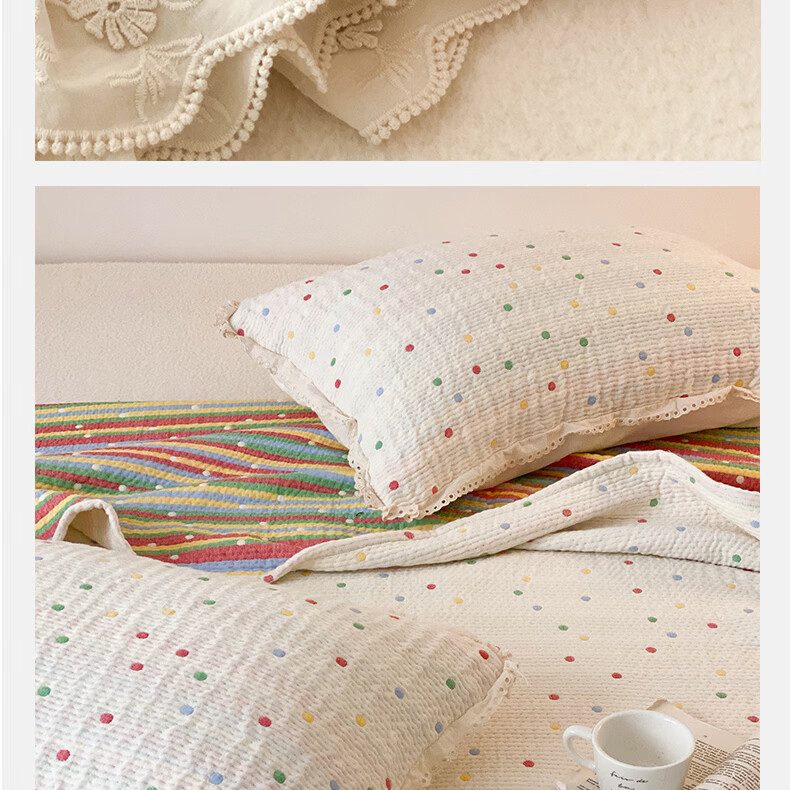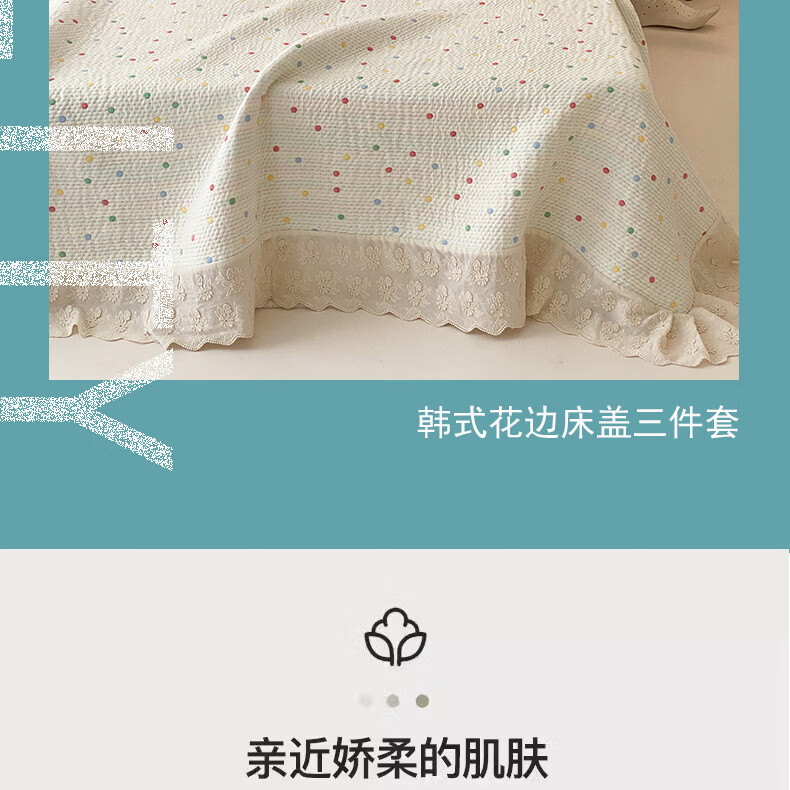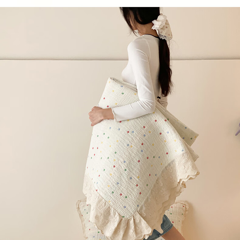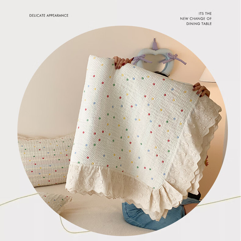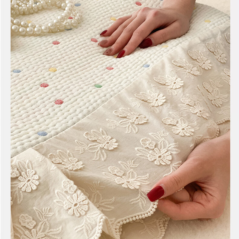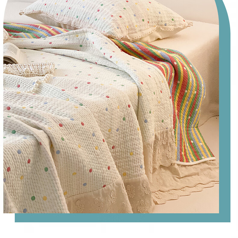 无印良品ins韩系全棉纱布床单1.8x2米床纯棉100%四季裸睡夹棉床盖单件家用 奶油波点-灰【色织花边工艺】 三件套: 250cm*230cm 床盖+枕套*2
