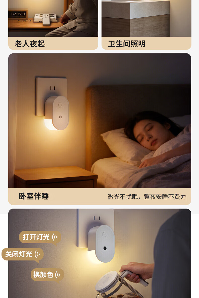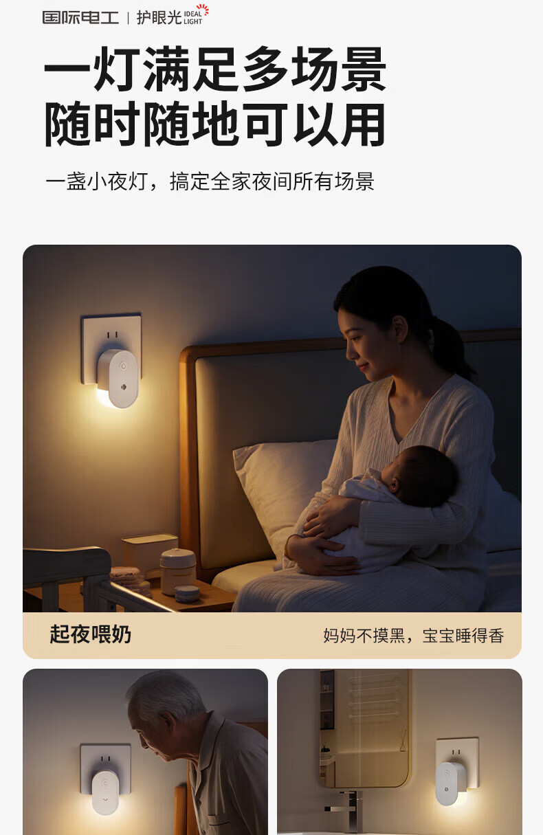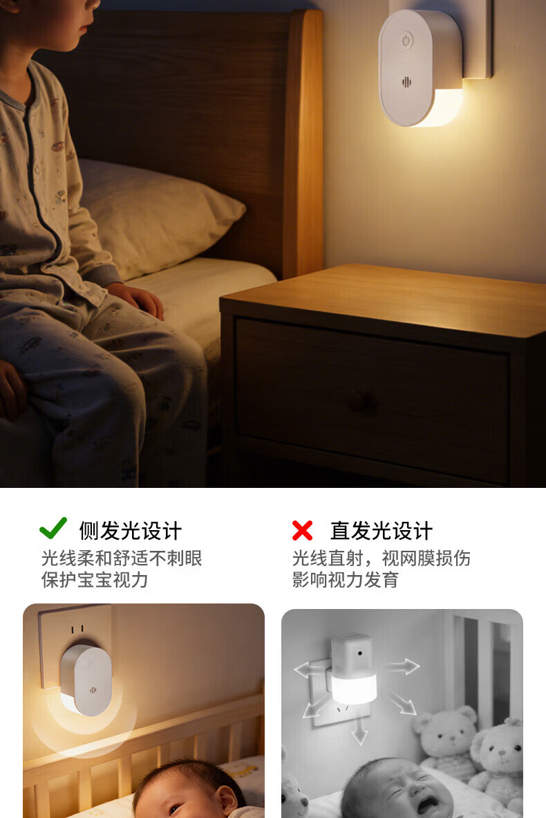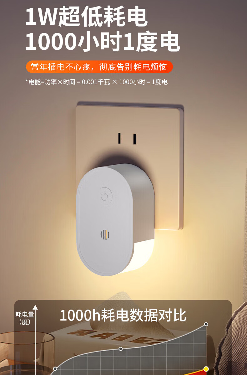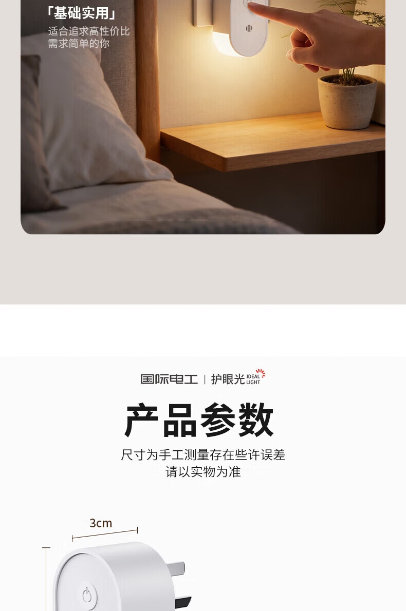 国际电工(FDD)智能语音声控小夜灯床头灯卧室柔光护眼伴睡起夜高颜值插电遥控灯 侧发光小夜灯【按键款 1W】