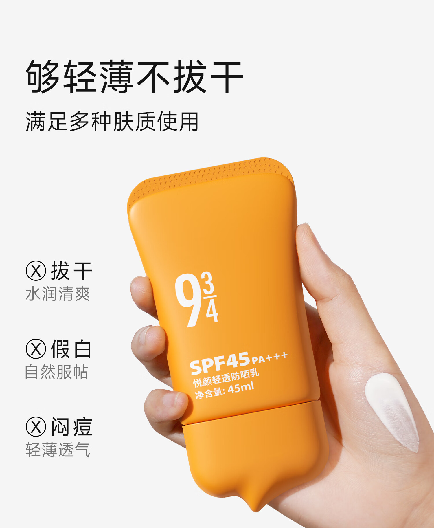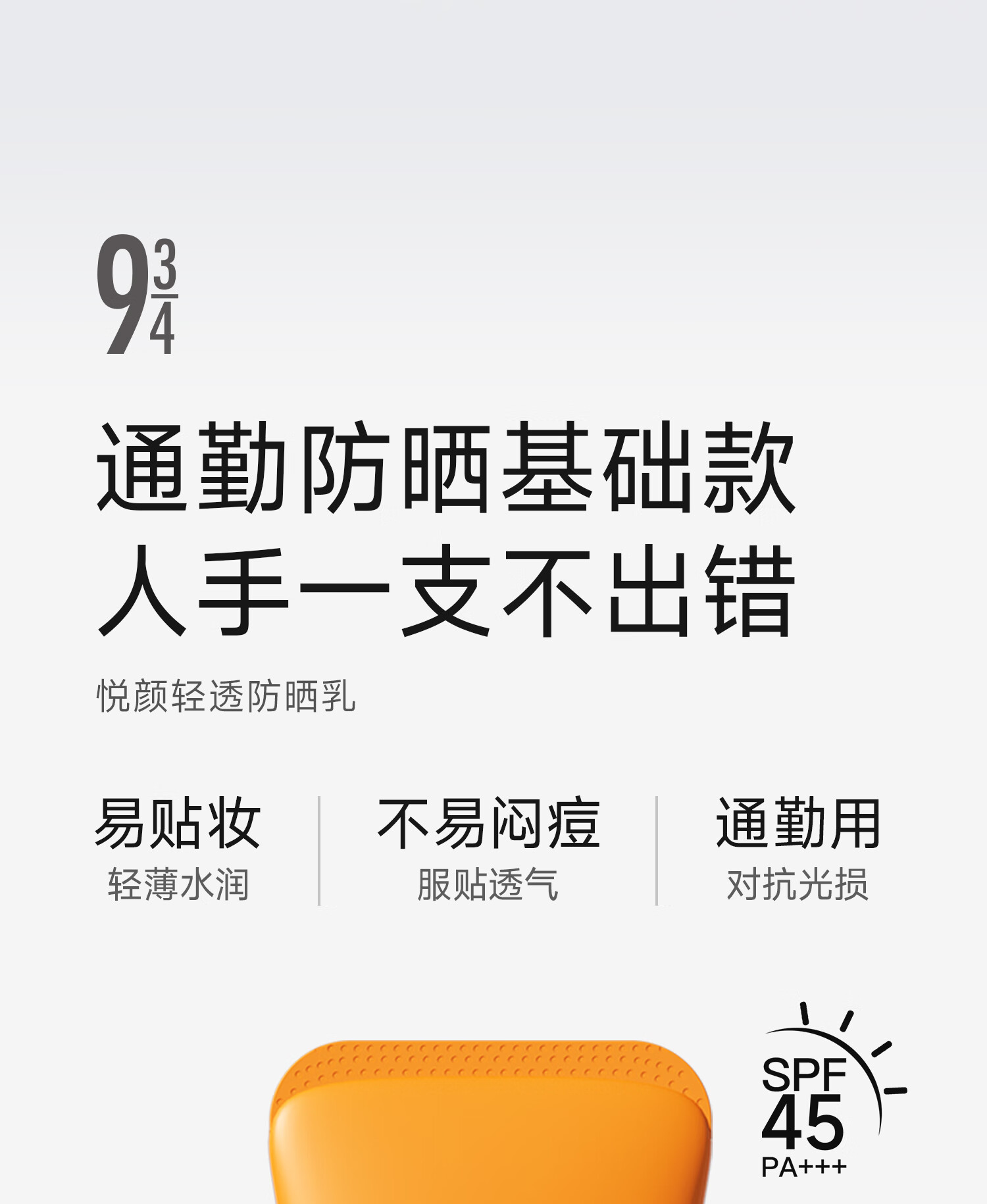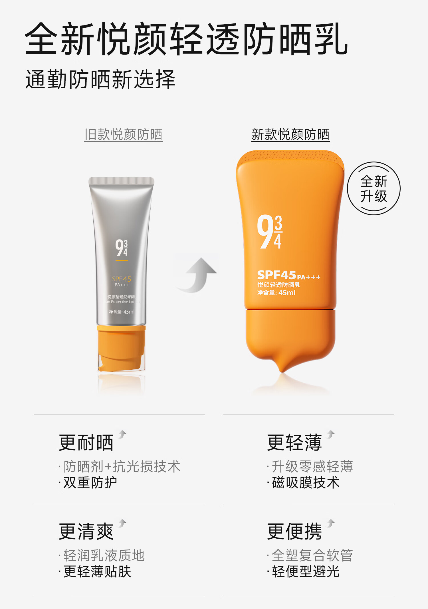 934 悦颜新升级轻透防晒乳通勤清爽轻薄学生防晒男女适用 45ml