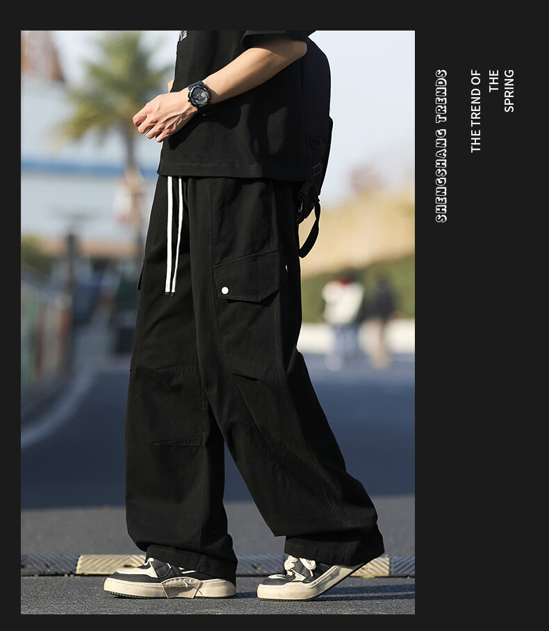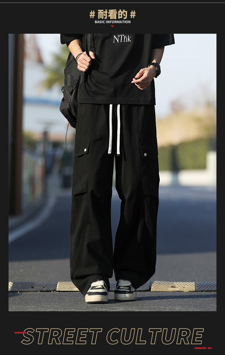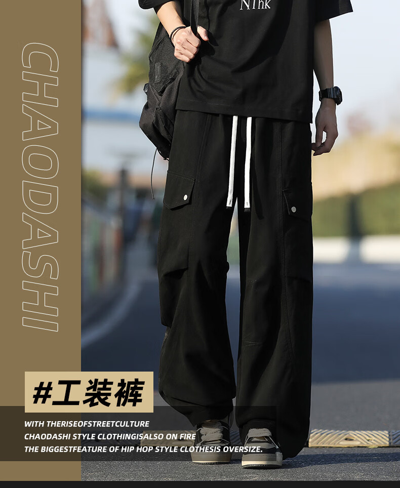 真维斯纯棉复古工装裤男士2026春季美式潮牌宽松直筒百搭休闲裤子 黑色 M