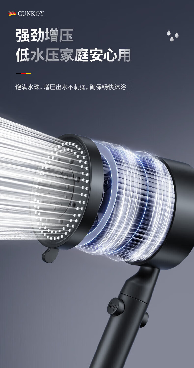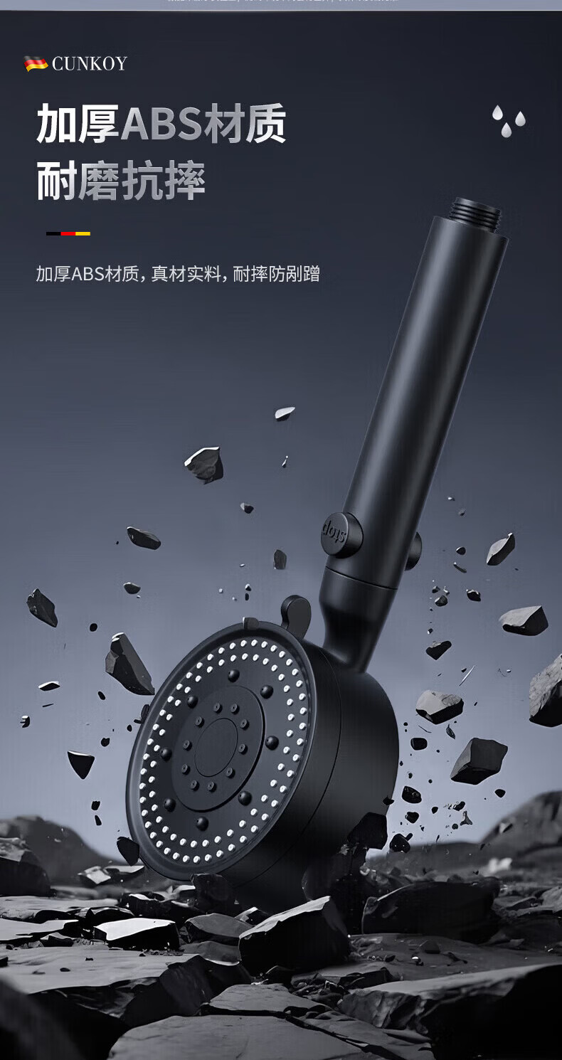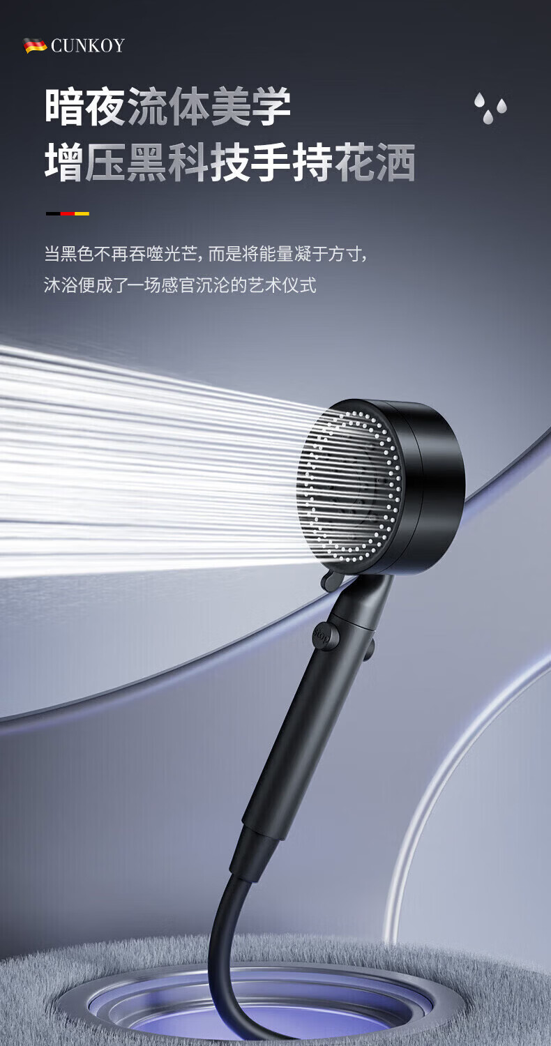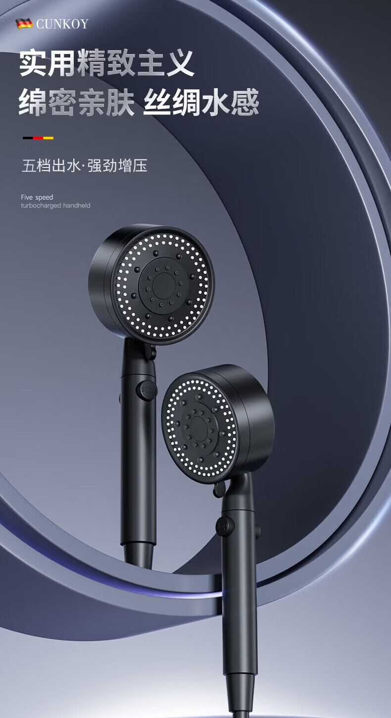 CUNKOY【德国】淋浴增压花洒喷头带软管一套浴室洗澡加压莲蓬花洒头套装 五档调节【一键止水】雅黑 强劲增压丨密集大出水
