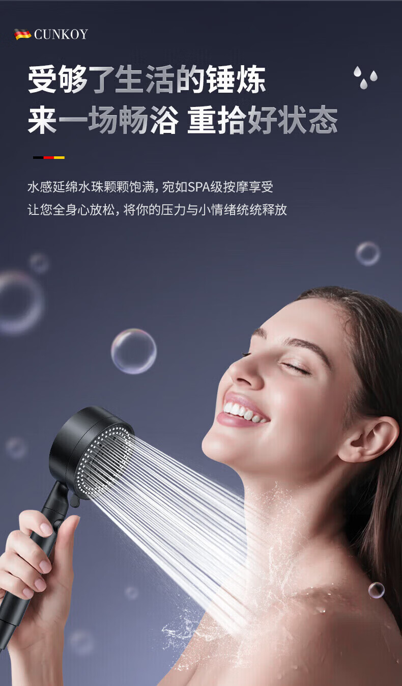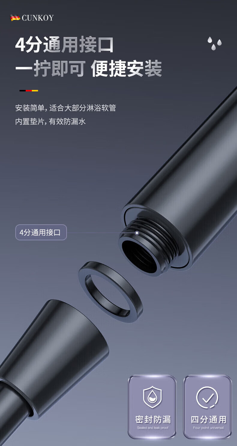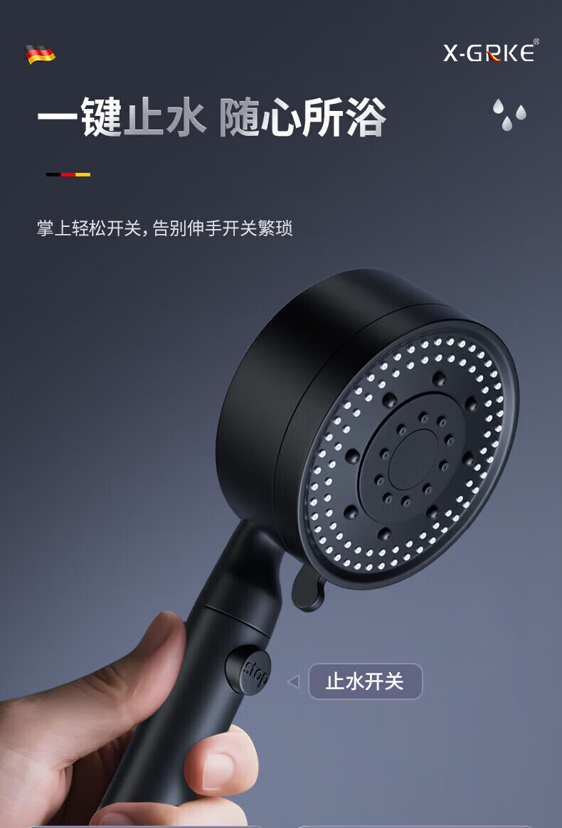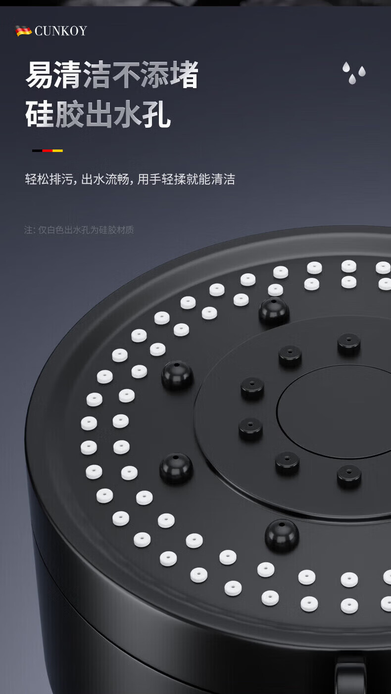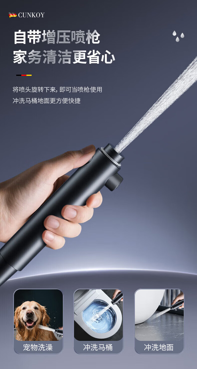 CUNKOY【德国】淋浴增压花洒喷头带软管一套浴室洗澡加压莲蓬花洒头套装 五档调节【一键止水】雅黑 强劲增压丨密集大出水