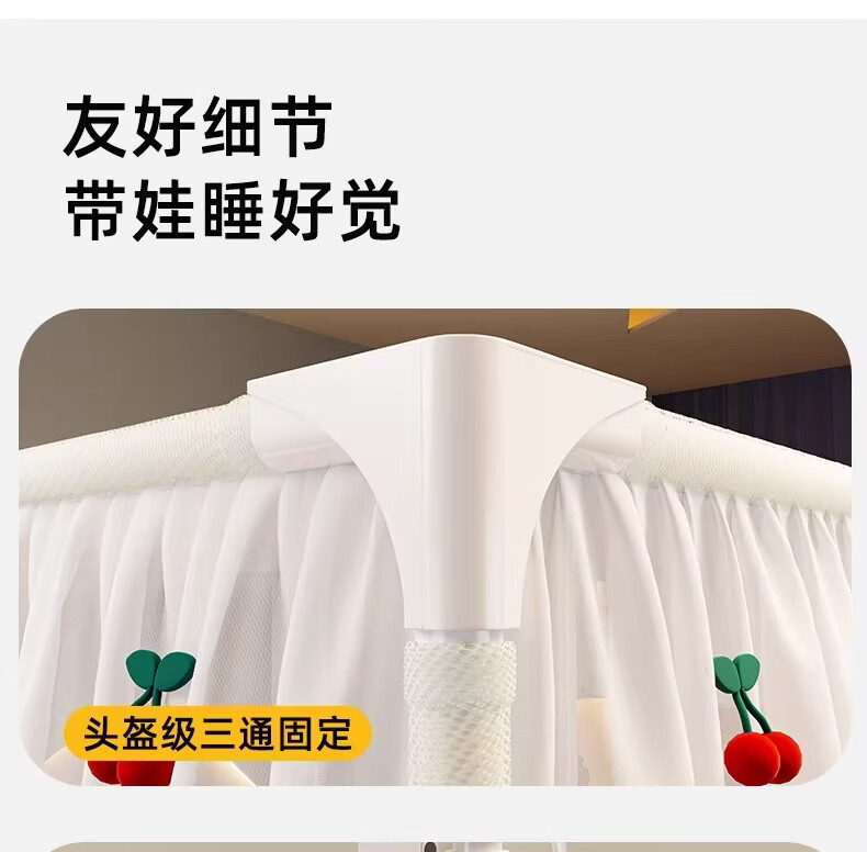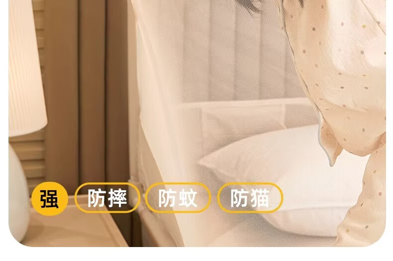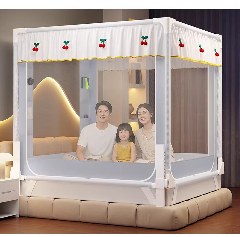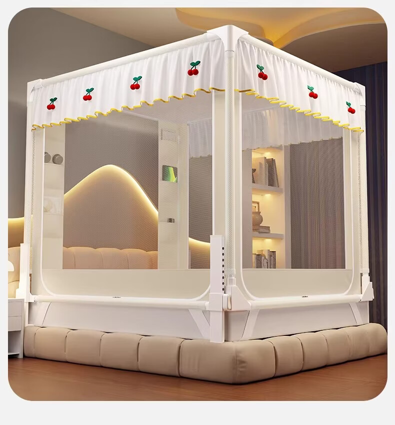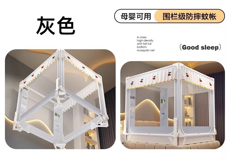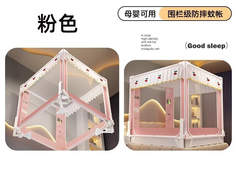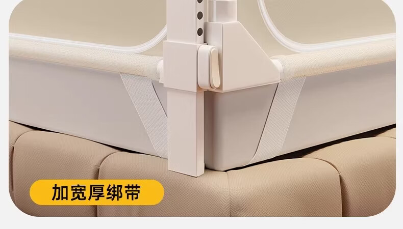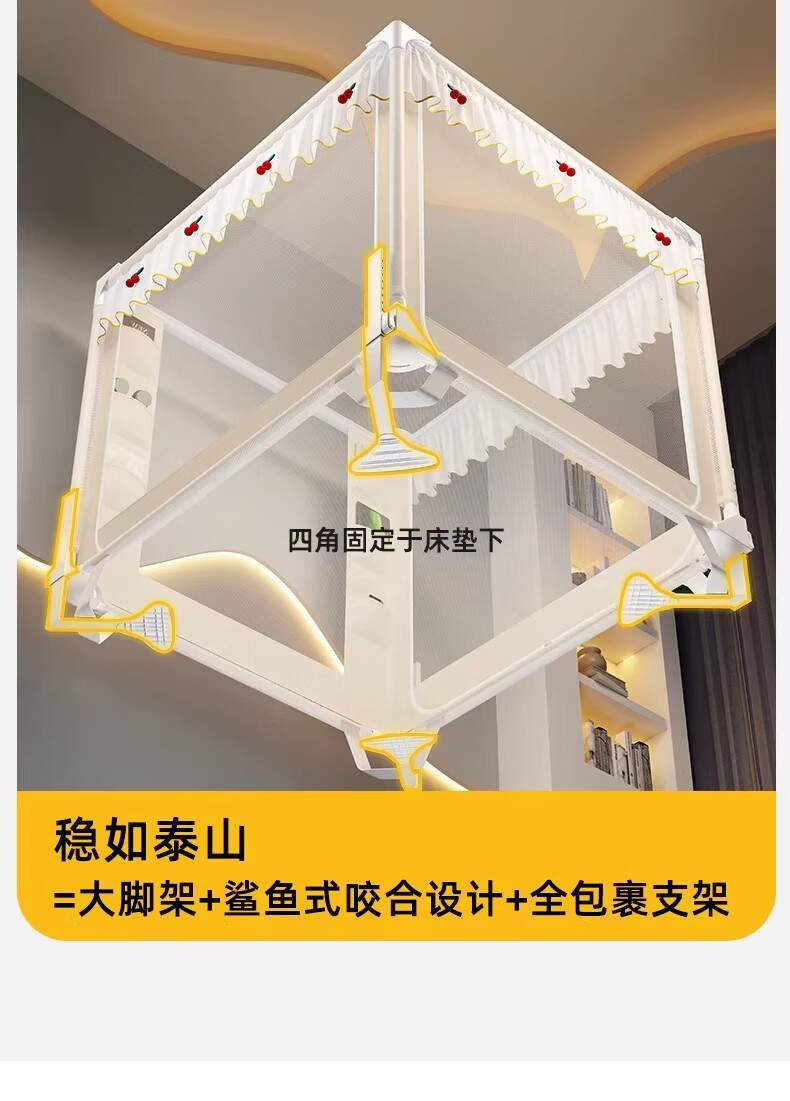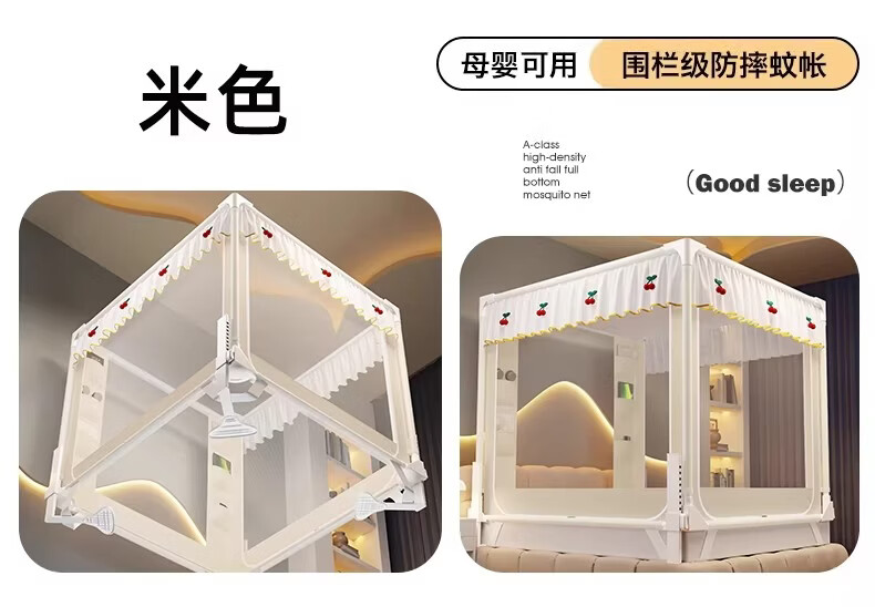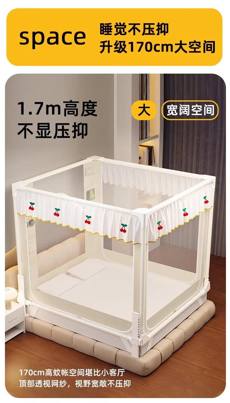 无印良品婴幼儿防摔蚊帐架1.8x2米家用a类宝宝防掉床围栏蚊帐一体式免安装 樱桃-米色【加粗托底支架 全包防摔MAX】 180cm*200cm*170cm 专利围栏大脚板支架