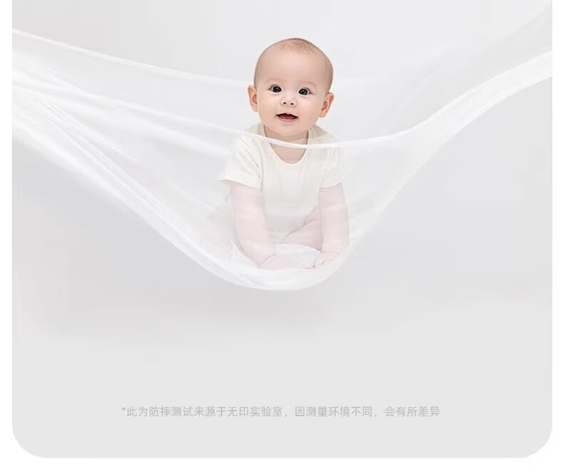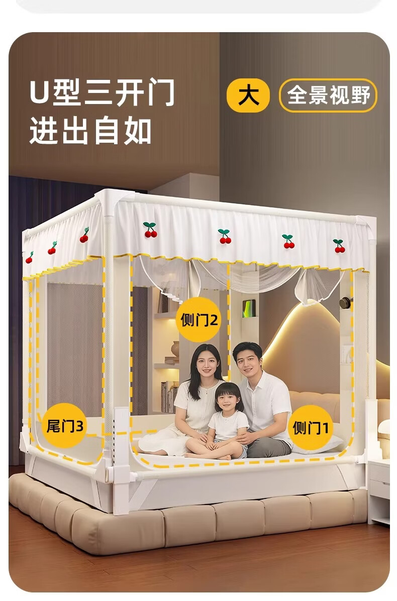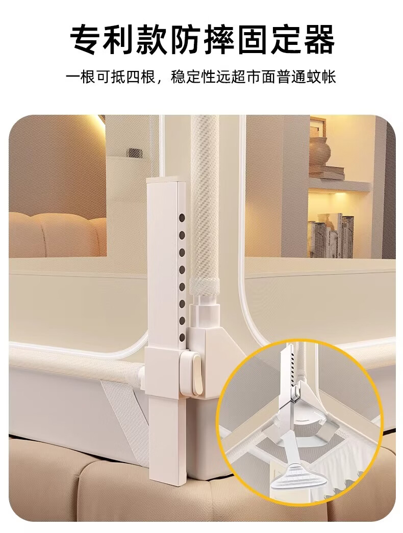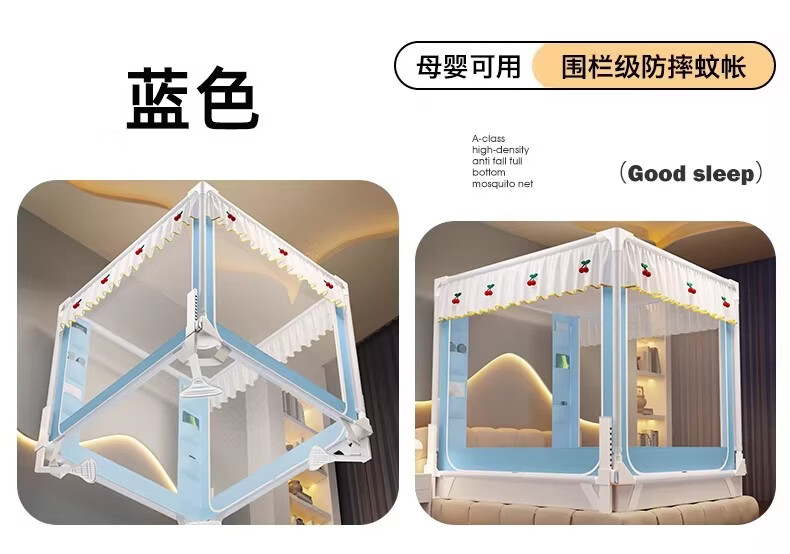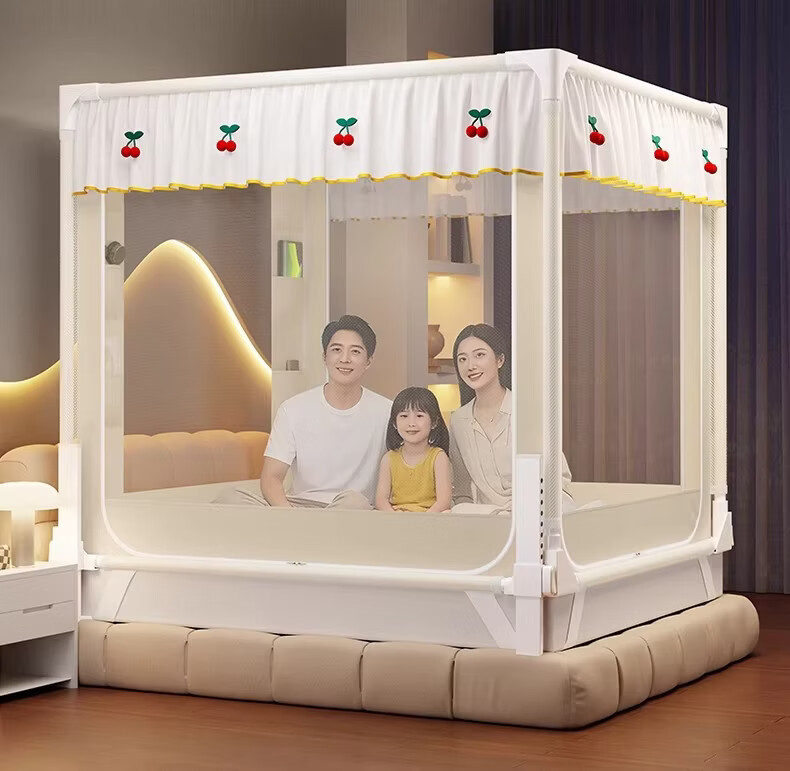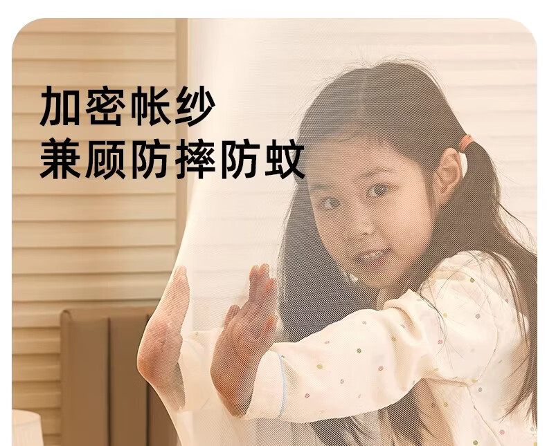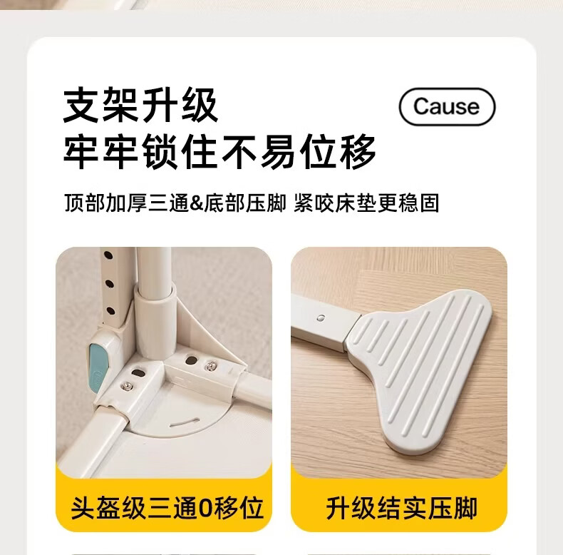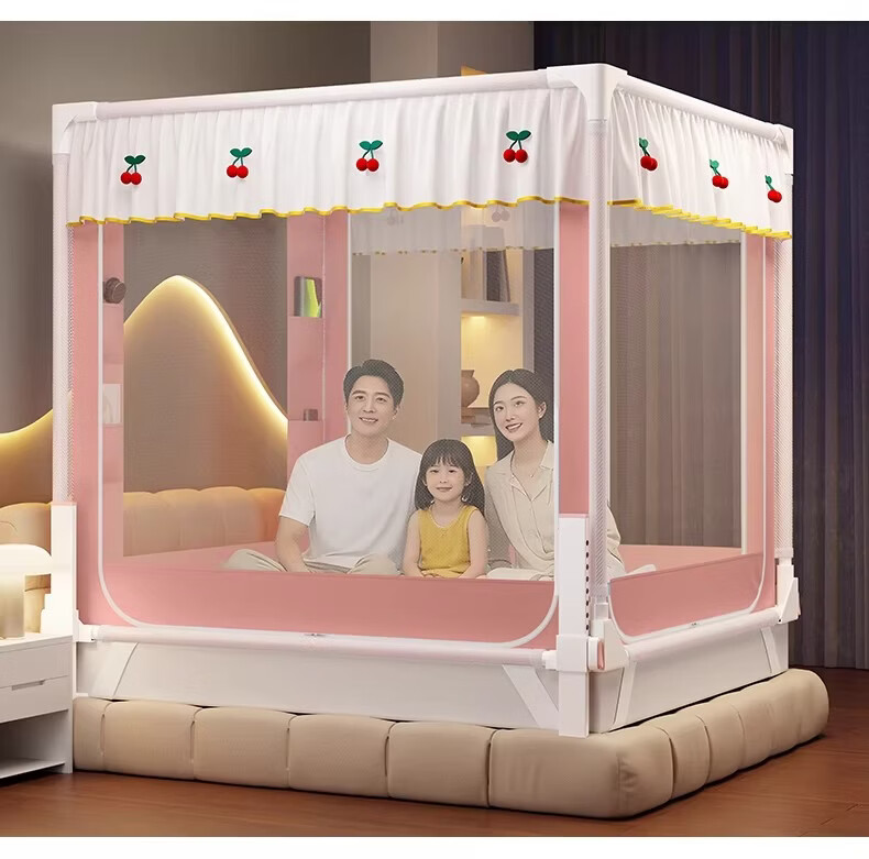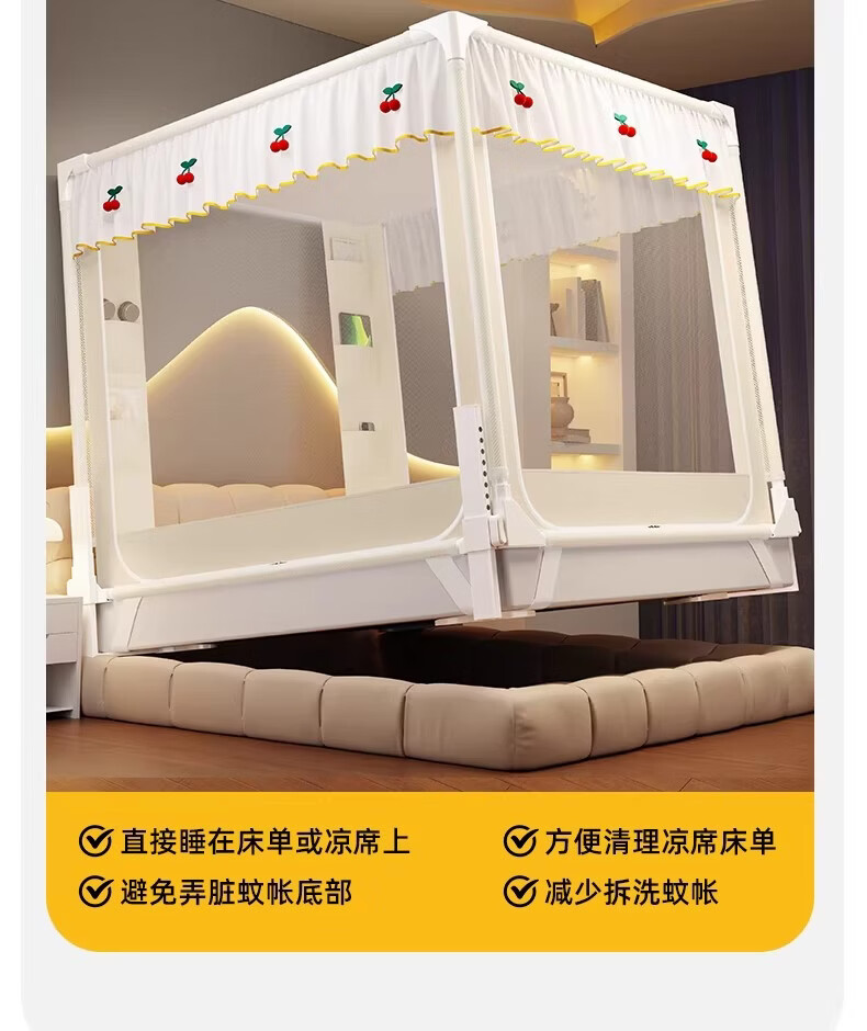 无印良品婴幼儿防摔蚊帐架1.8x2米家用a类宝宝防掉床围栏蚊帐一体式免安装 樱桃-米色【加粗托底支架 全包防摔MAX】 180cm*200cm*170cm 专利围栏大脚板支架