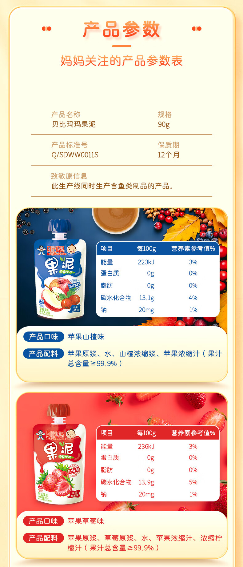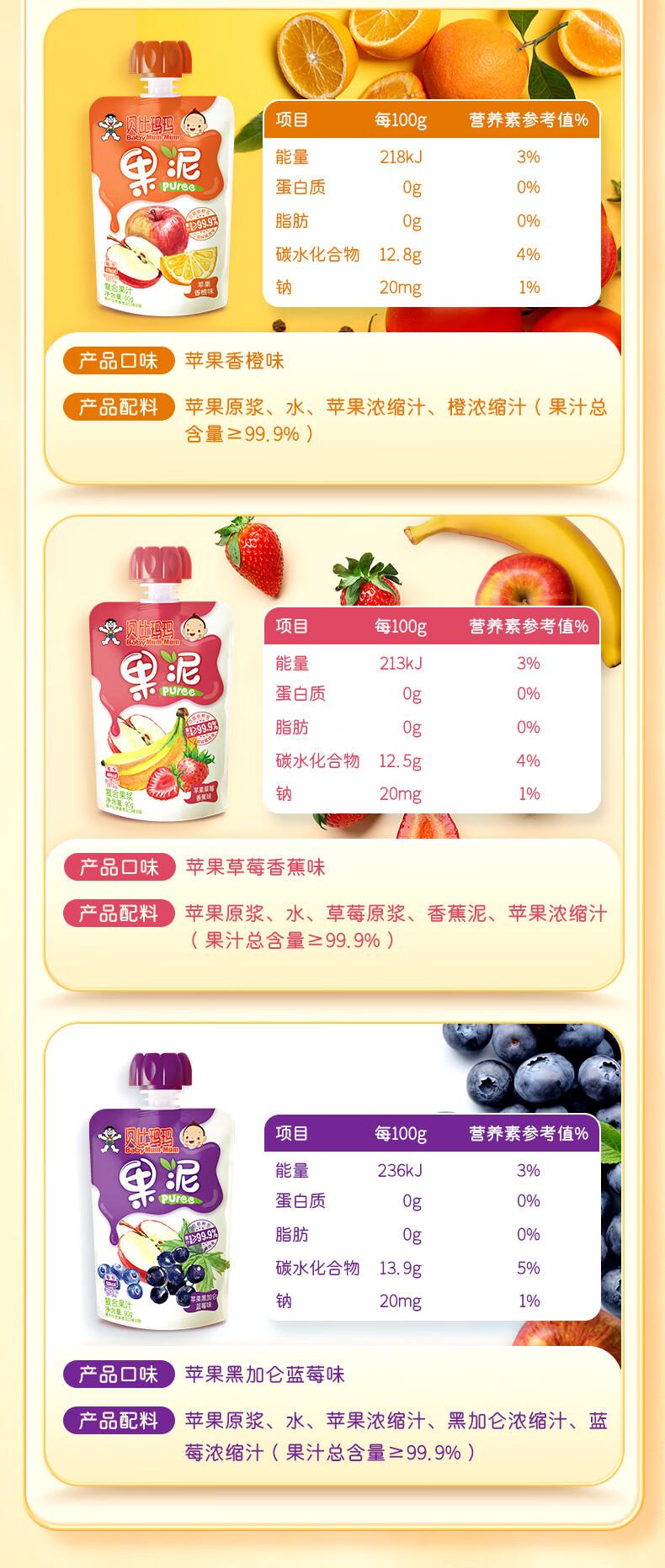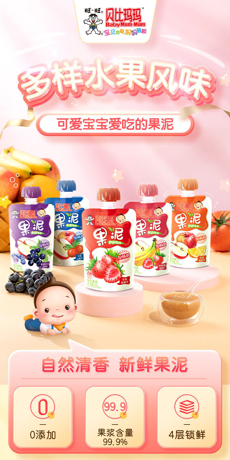 贝比玛玛旺旺旗下果泥儿童零食无添加糖盐草莓香蕉泥90g*1袋辅食泥