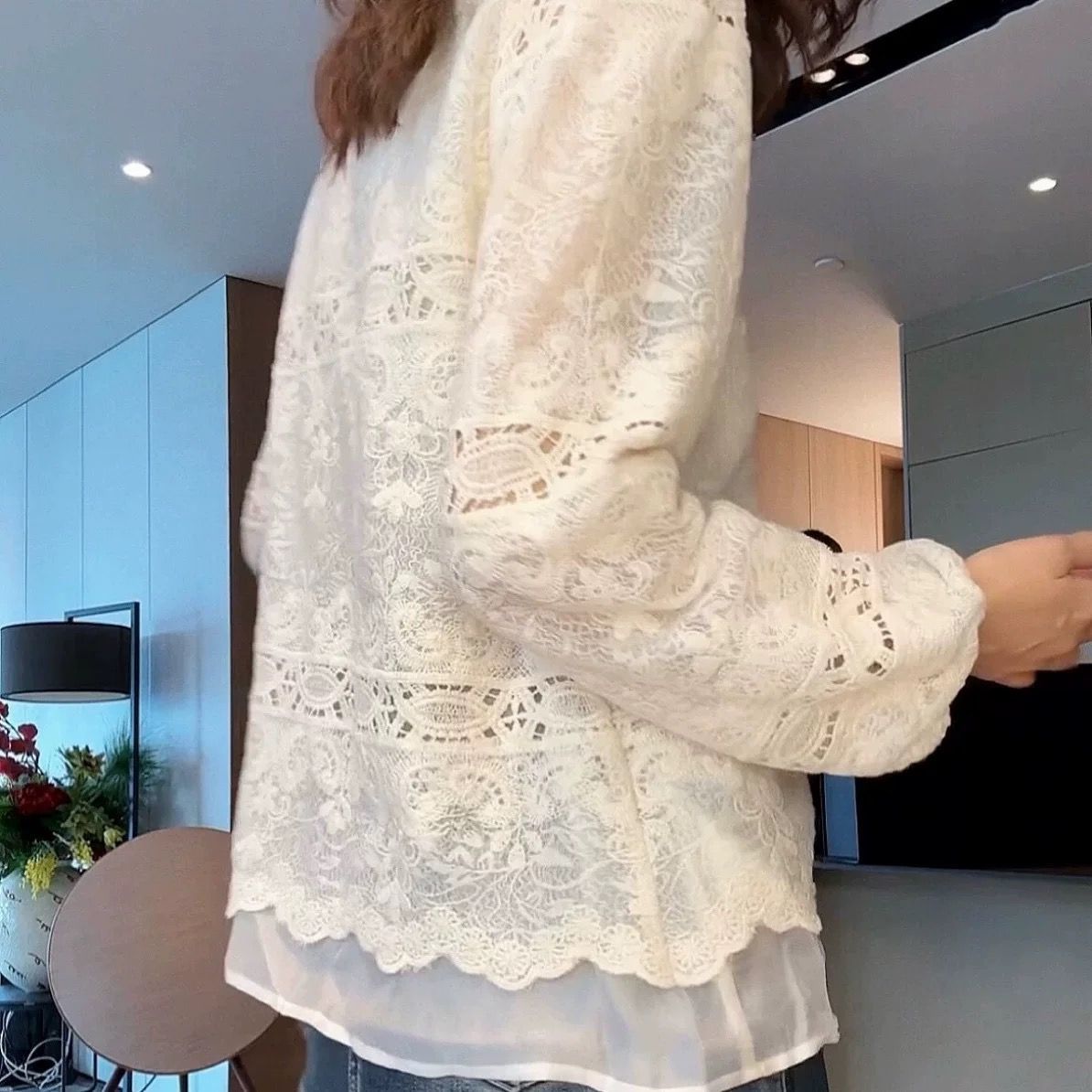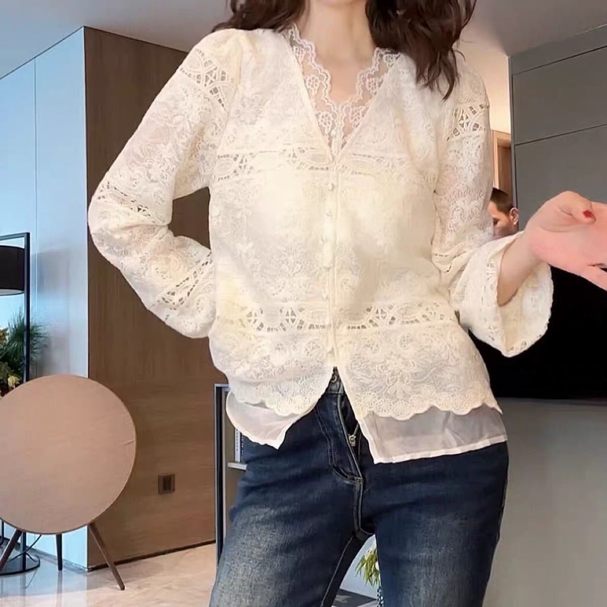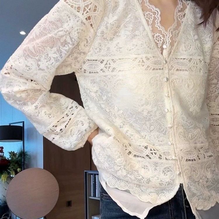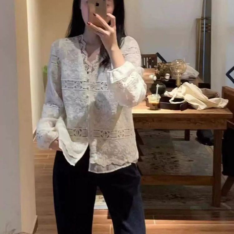 2026春新款重工蕾丝刺绣百搭V领打底衫气质衬衫上衣显瘦洋气小衫