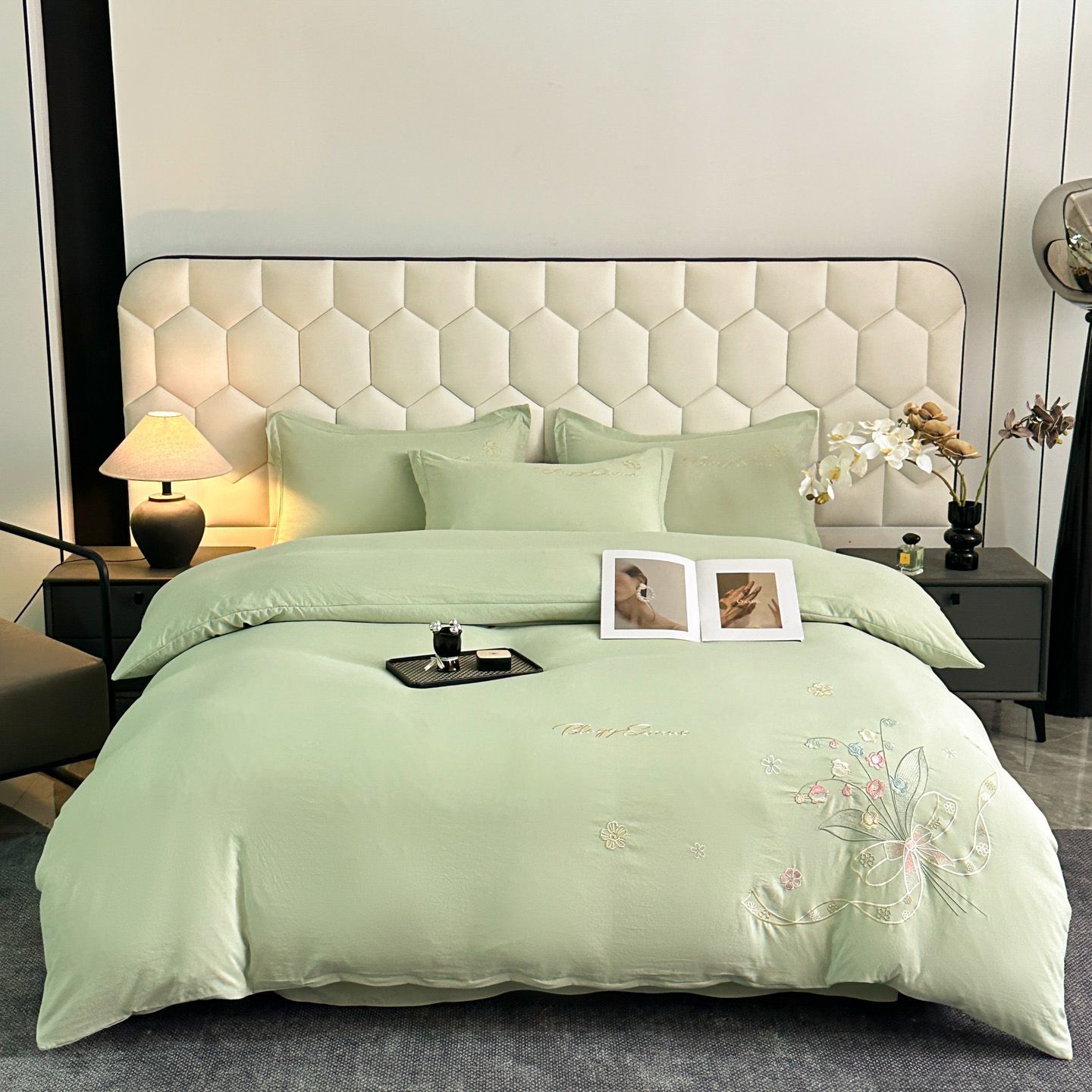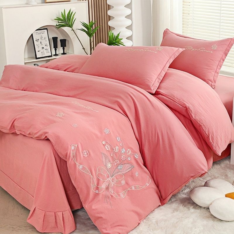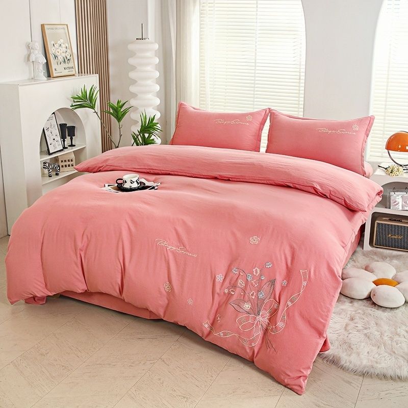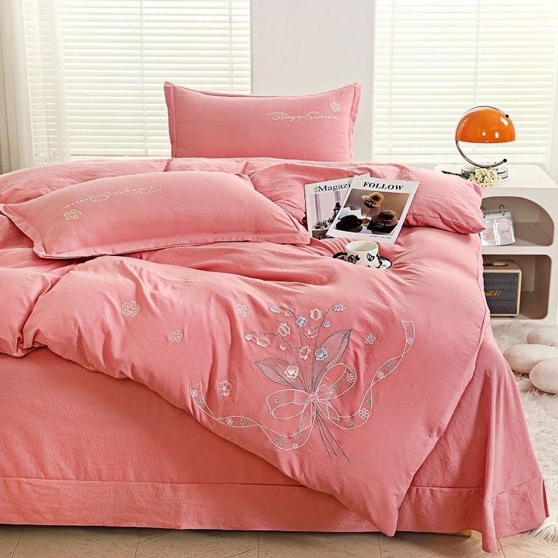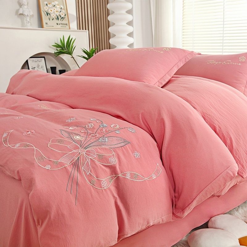 新款A类高端水洗棉刺绣四件套绣花亲肤纯色磨毛被套被罩床上用品