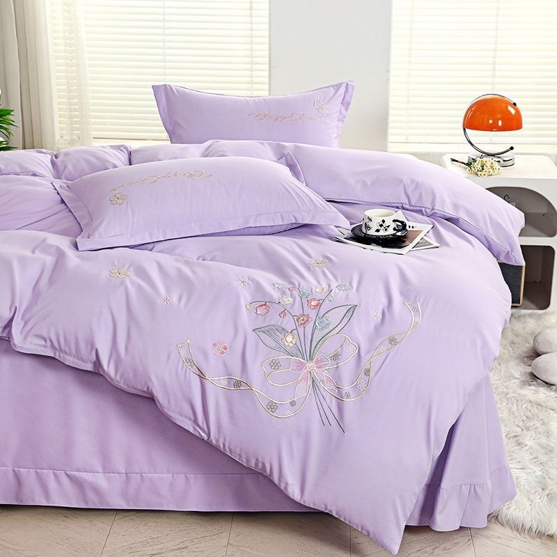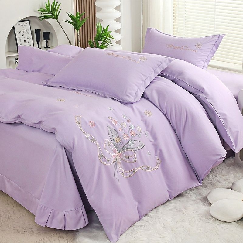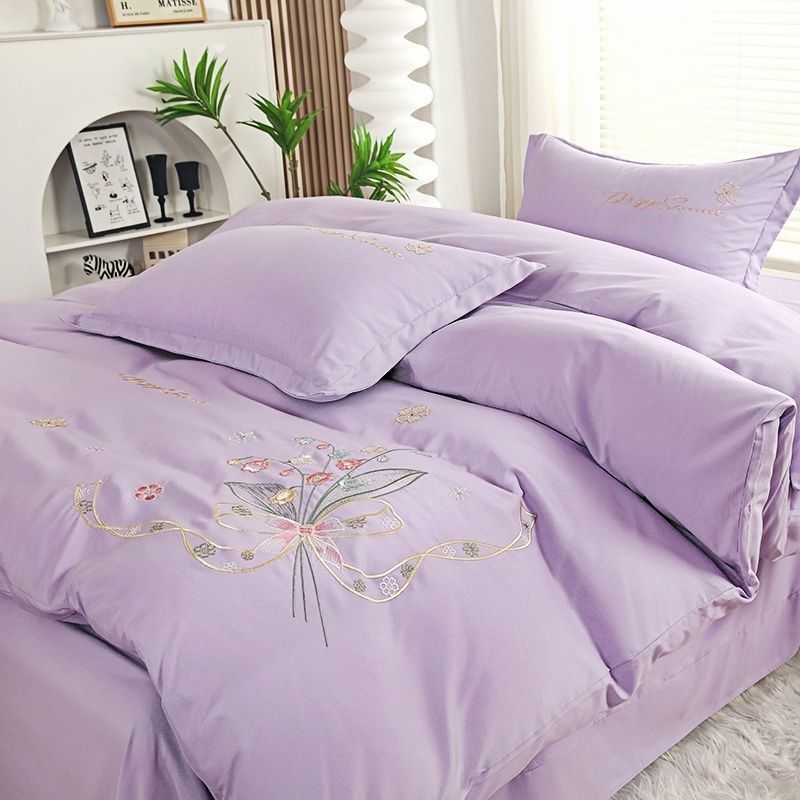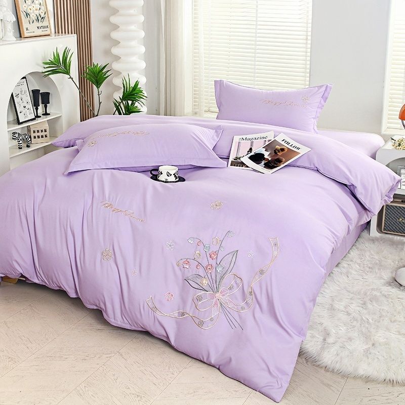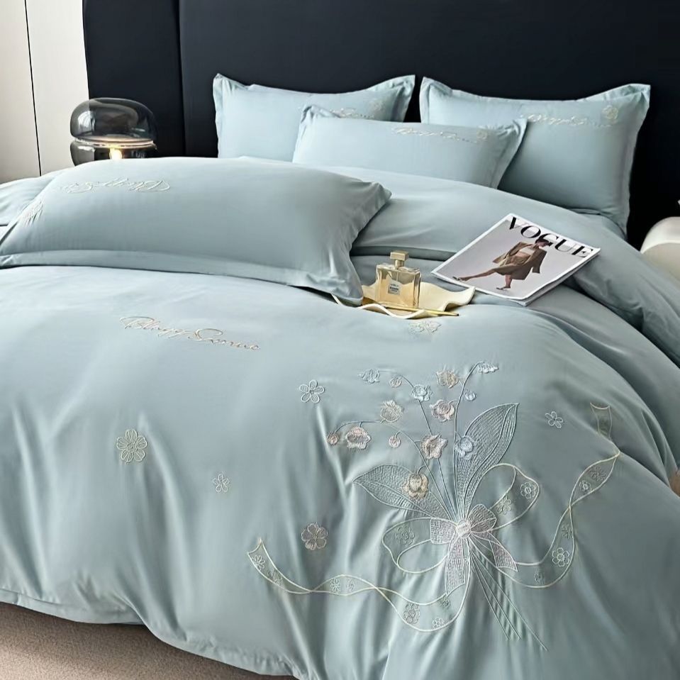 新款A类高端水洗棉刺绣四件套绣花亲肤纯色磨毛被套被罩床上用品